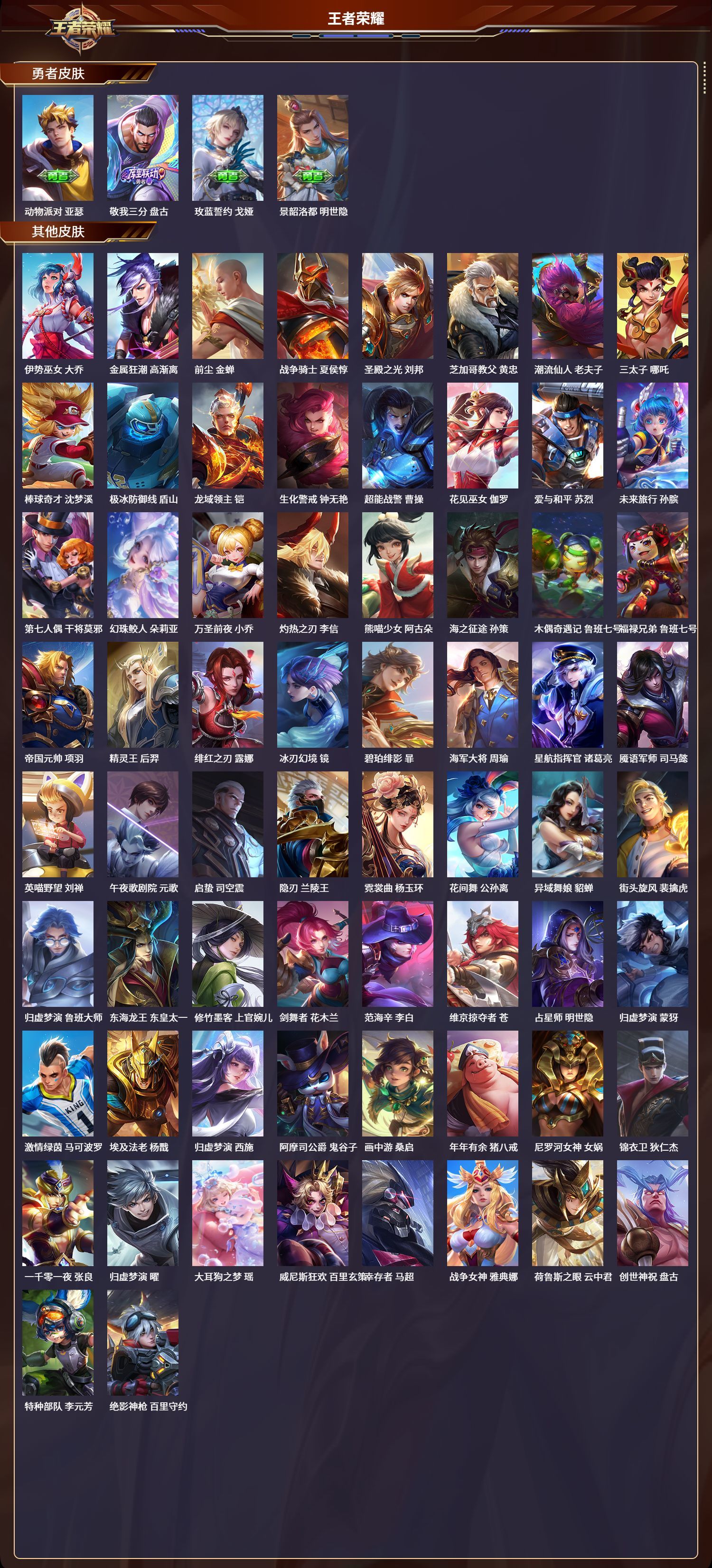 安卓QQ/非凡王者/364皮肤/124英雄/1典藏/0珍品无双/0无双/2珍品传说/17传说/100