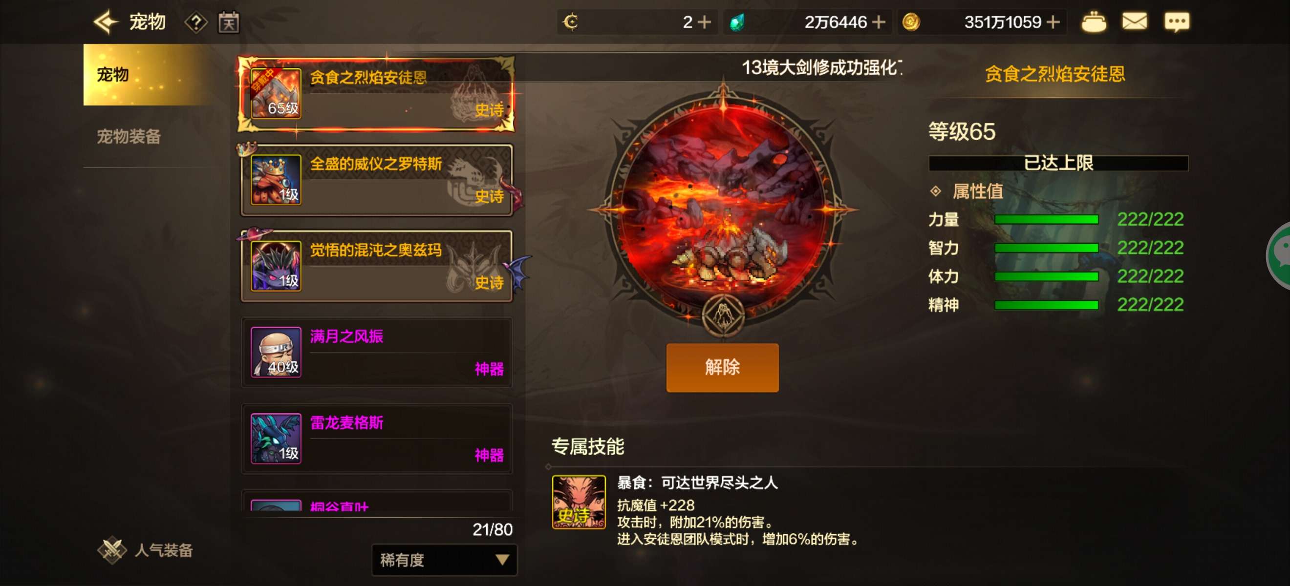 两个角色满尊红眼。大枪。 主c四宝珠四尊属强87。武器增幅十全身六七。安图恩21 副c大枪满配四