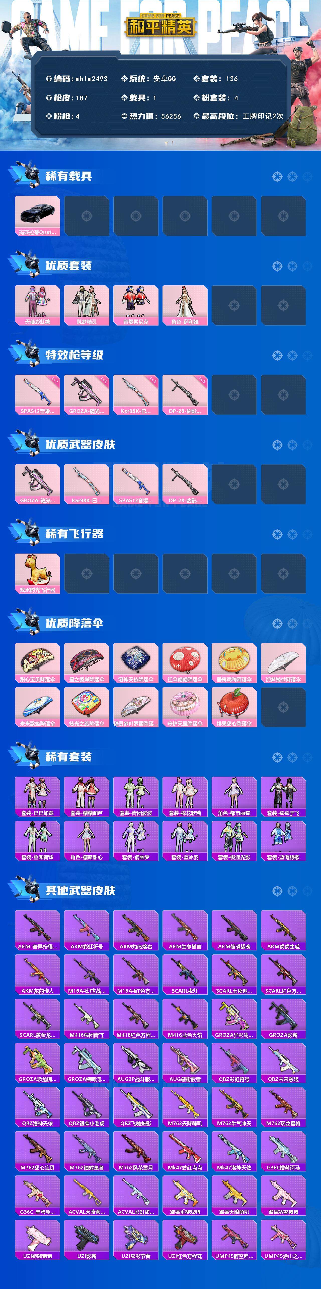 【mhlm2493】安卓 手Q-4粉装-4特效枪-1载具-1粉色飞行器-56256热力值-2王牌印记-136套装-187枪皮