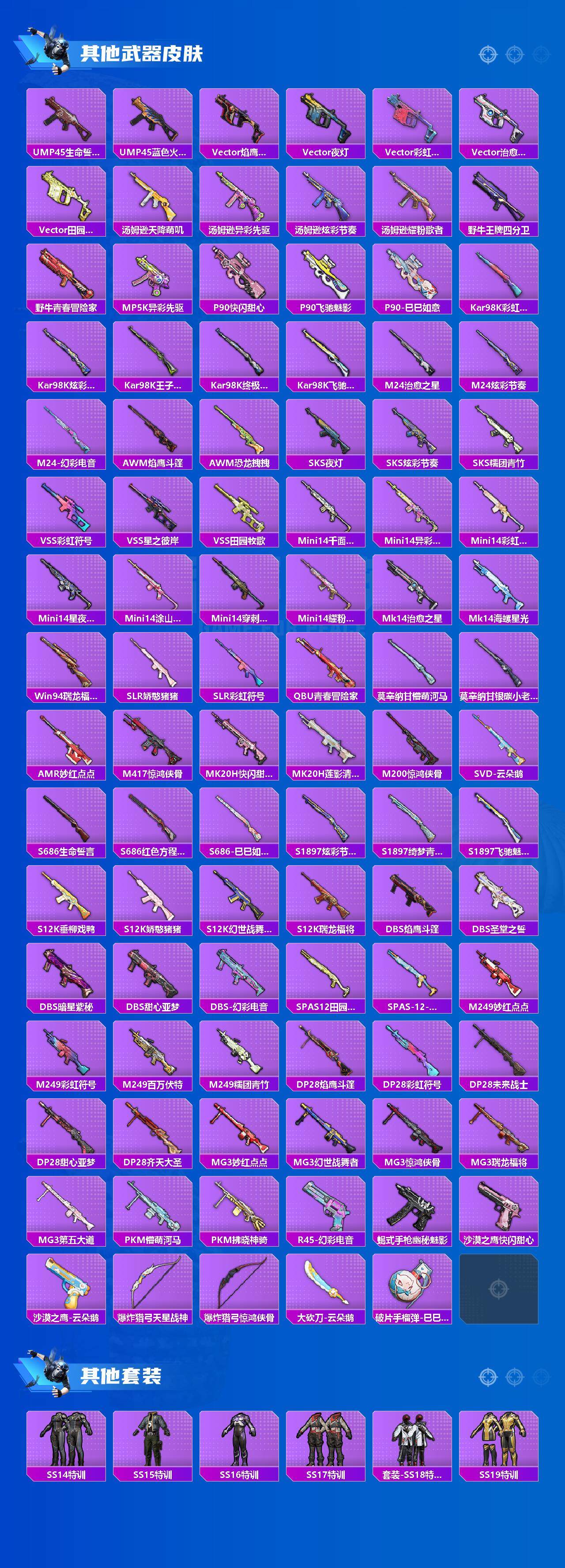 【粉色枪皮等级】:AKM-星际浪客(七级),SCAR-L-锦绣绵绵(五级),AUG-暖羊咩咩(五级),Kar98K-巳巳如意(五级),DP-28-豹影疾电(五级),MG-36-幻彩电音(七级)