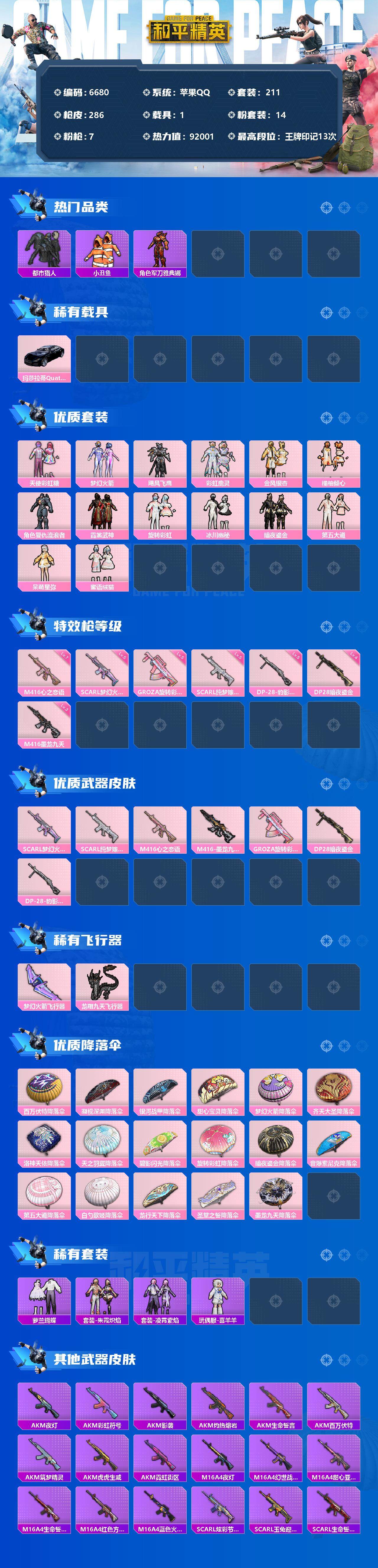 【6680】【商品标题】:苹果 手Q-14粉装-7特效枪-1载具-2粉色飞行器-92001热力值-13王牌印记-211套装-286枪皮
