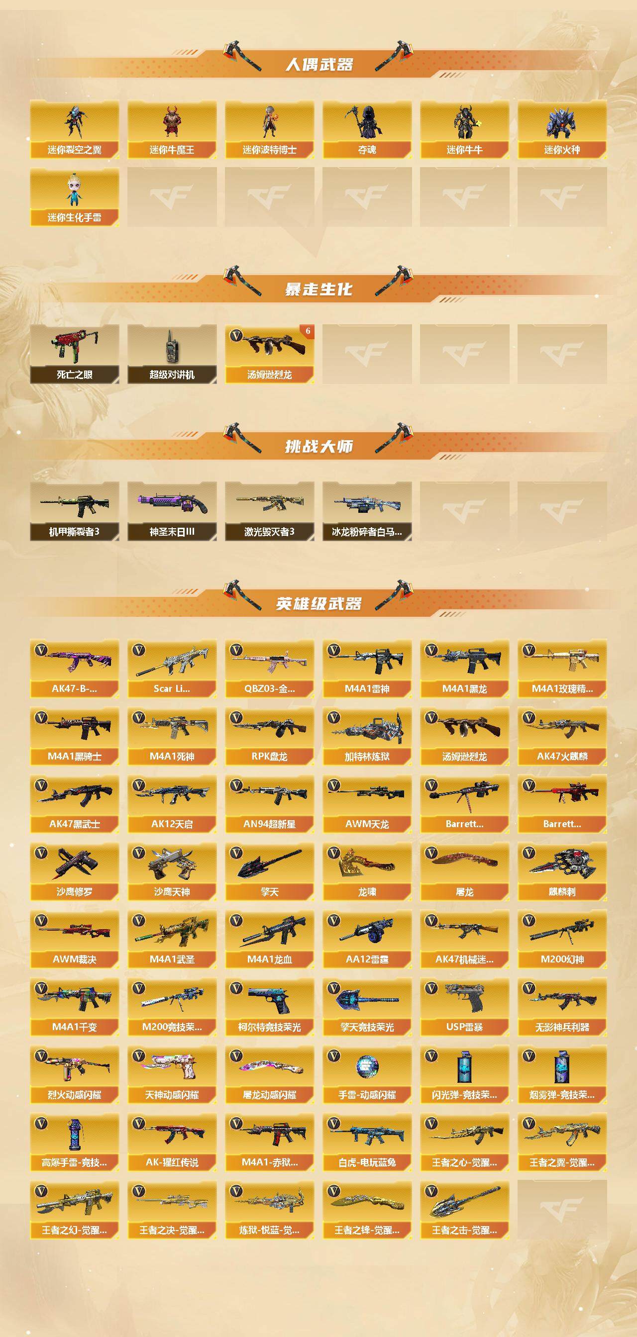 【热门武器】:传说辉光,QBZ03-金色蔷薇,Scar Light-白虎,M200-幻神,M200-竞技荣光,死亡之眼,白虎-电玩蓝兔,M4A1-黑骑士,汤姆逊-烈龙*6,RPK-盘龙,加特林-炼狱,USP-雷暴,沙鹰-修罗*4