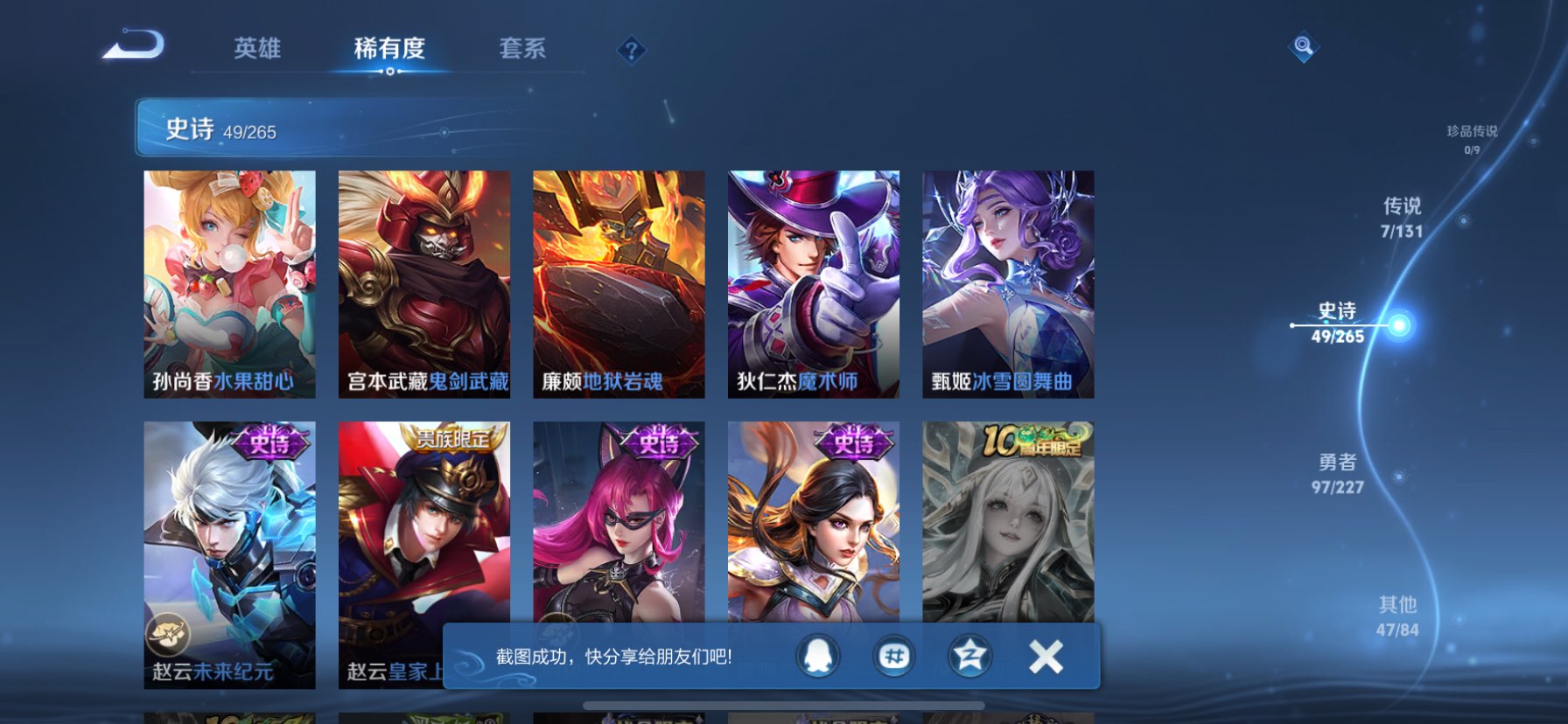 【史诗皮肤】 百相守梦 决胜骁骑 龙之律动 天狼溯光者 敬我三分 决胜骁骑 至尊宝 决胜骁骑 王牌新星 江河有灵 决胜大满贯 布丁狗之约 完美运算 谧流熔炉 漠中幻影 百相守梦 魅语 幽灵船长 繁星吟游 拒霜思 功夫厨神 女仆咖啡 魅力维加斯 猫狗日记 魔术师 鹰眼统帅 鬼剑武藏 白龙吟 水晶猎龙者 修罗 曙光守护者 暗隐猎兽者 千年之狐 银河