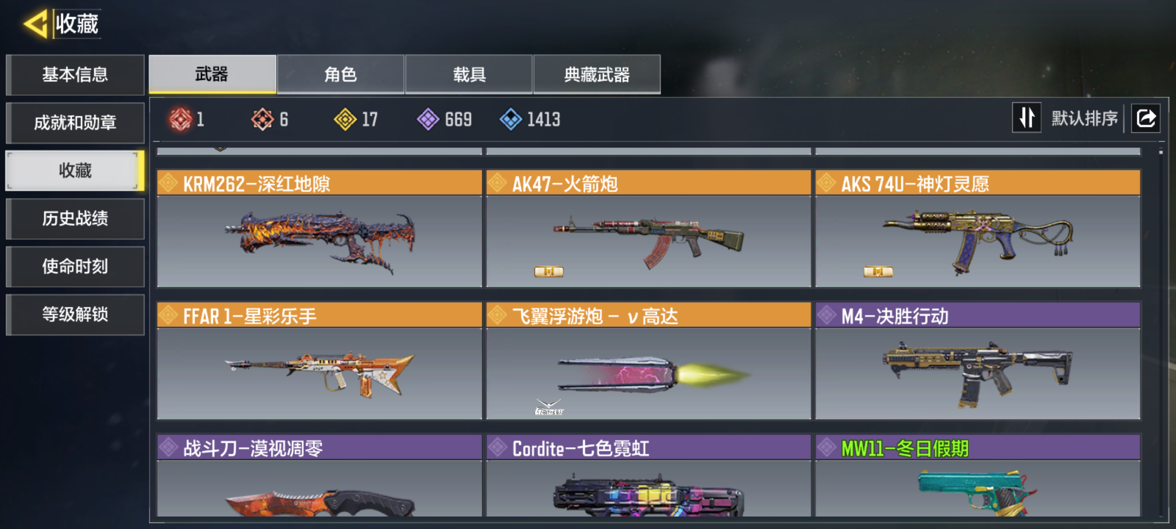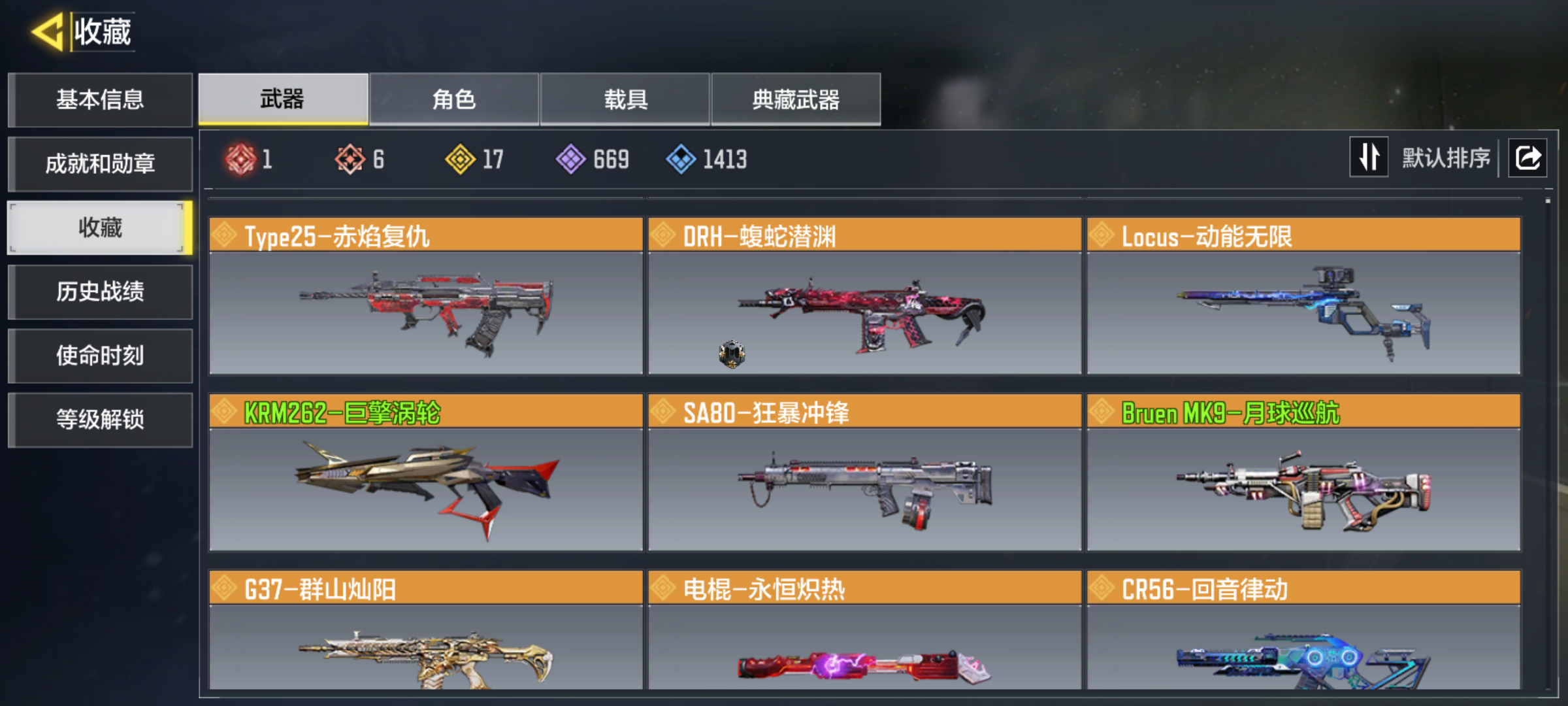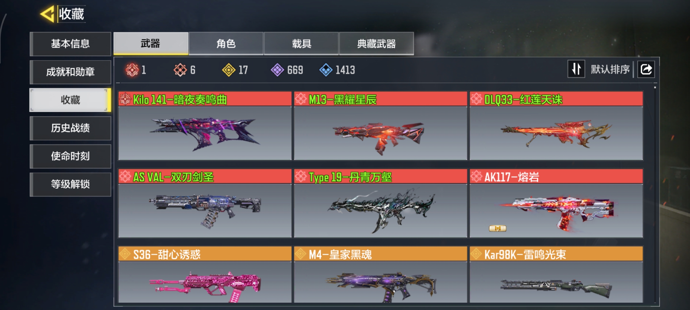 WLSM506【6神话1满级17传说动能无限】安卓Q-等级400-史诗枪械669【神话】 Kilo 141-暗夜奏鸣曲 (满级) AS VAL-双刃剑圣 M13-黑耀星辰 Type 19-丹青万壑 DLQ33-红莲天诛 AK117-熔岩 【17传说】 S36-甜心诱惑 M4-皇家黑魂 Kar98K-雷鸣光束 Type25-赤焰复仇 KRM262-巨擎涡轮 G37-群山灿阳 DRH-蝮蛇潜渊 SA80-狂暴冲锋 电棍-永恒炽热 Locus-动能无限 Bruen 9-月球巡航 CR56-回音律动 K