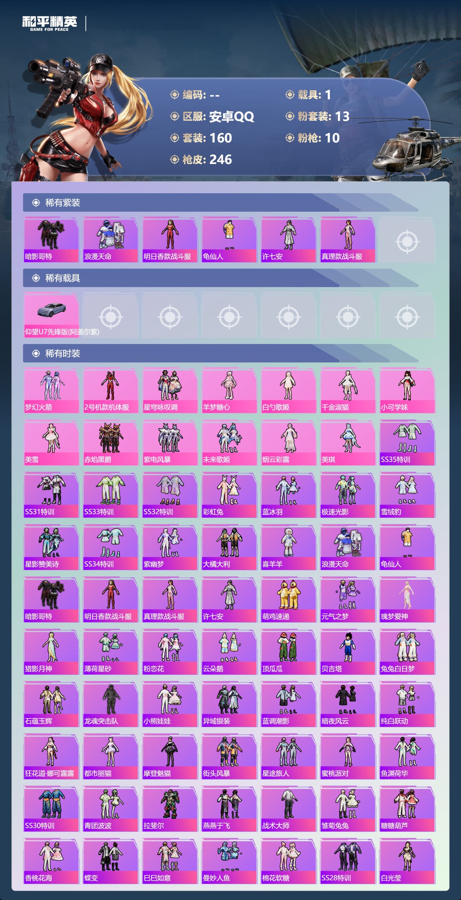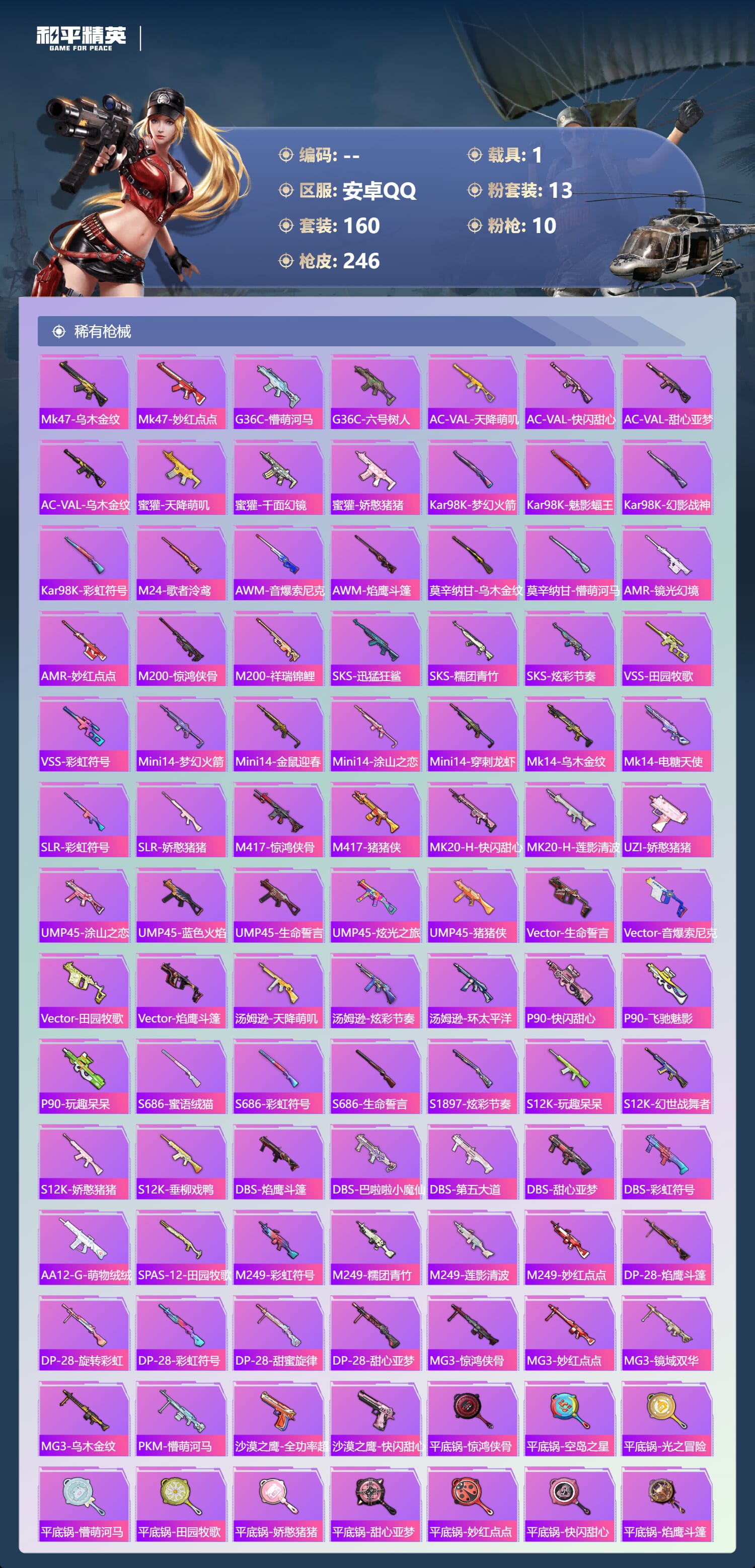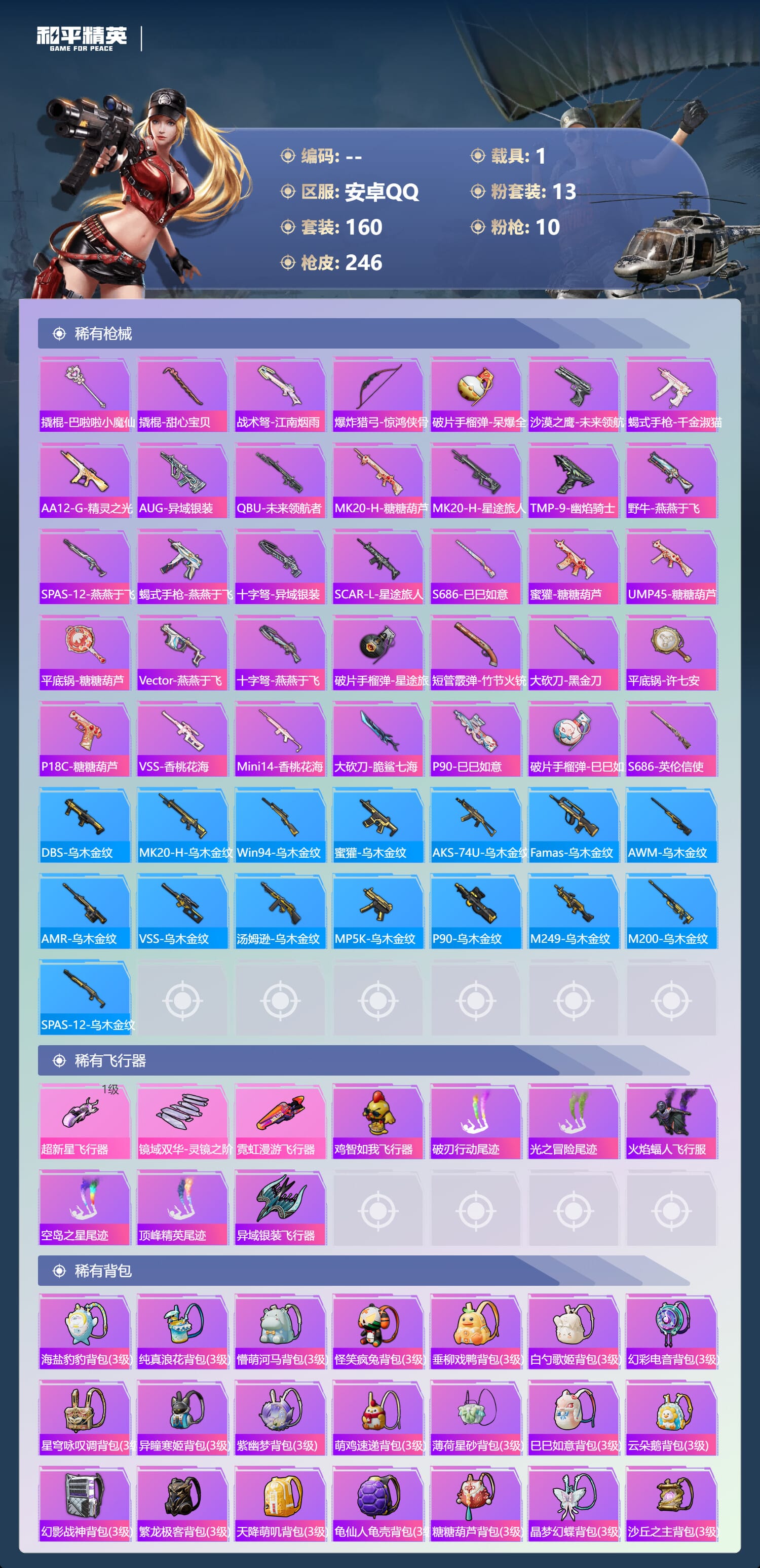 a4168/安卓QQ/-13王牌印记-13粉装-10特效枪-1载具-79334热力值-160套装-2