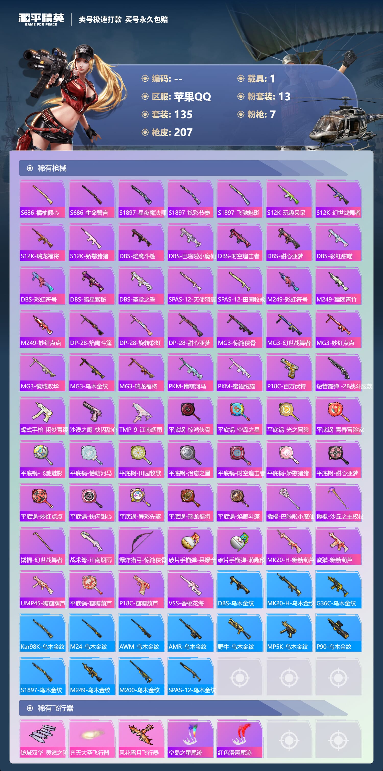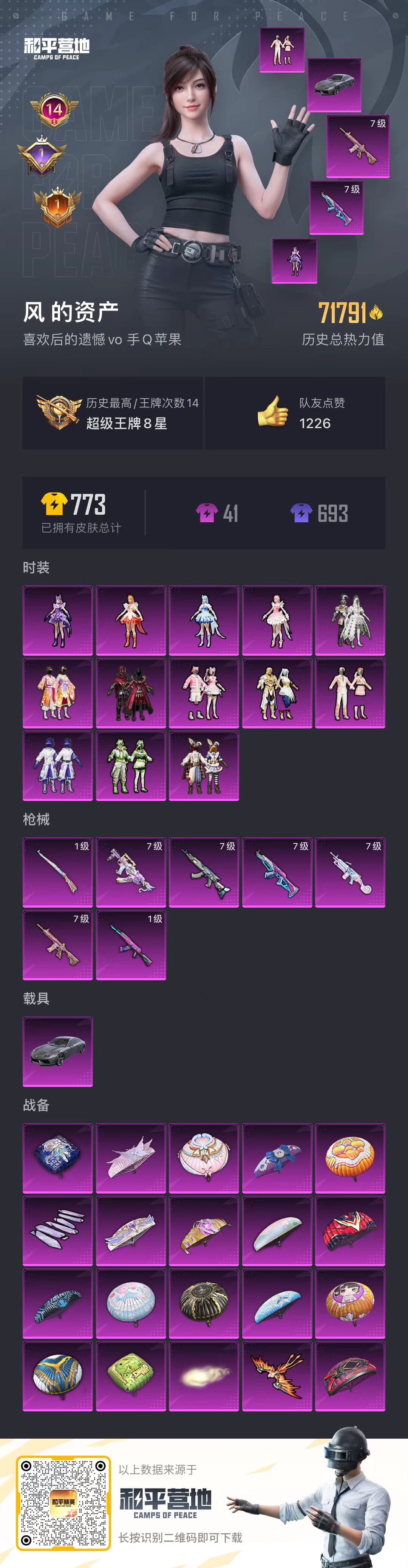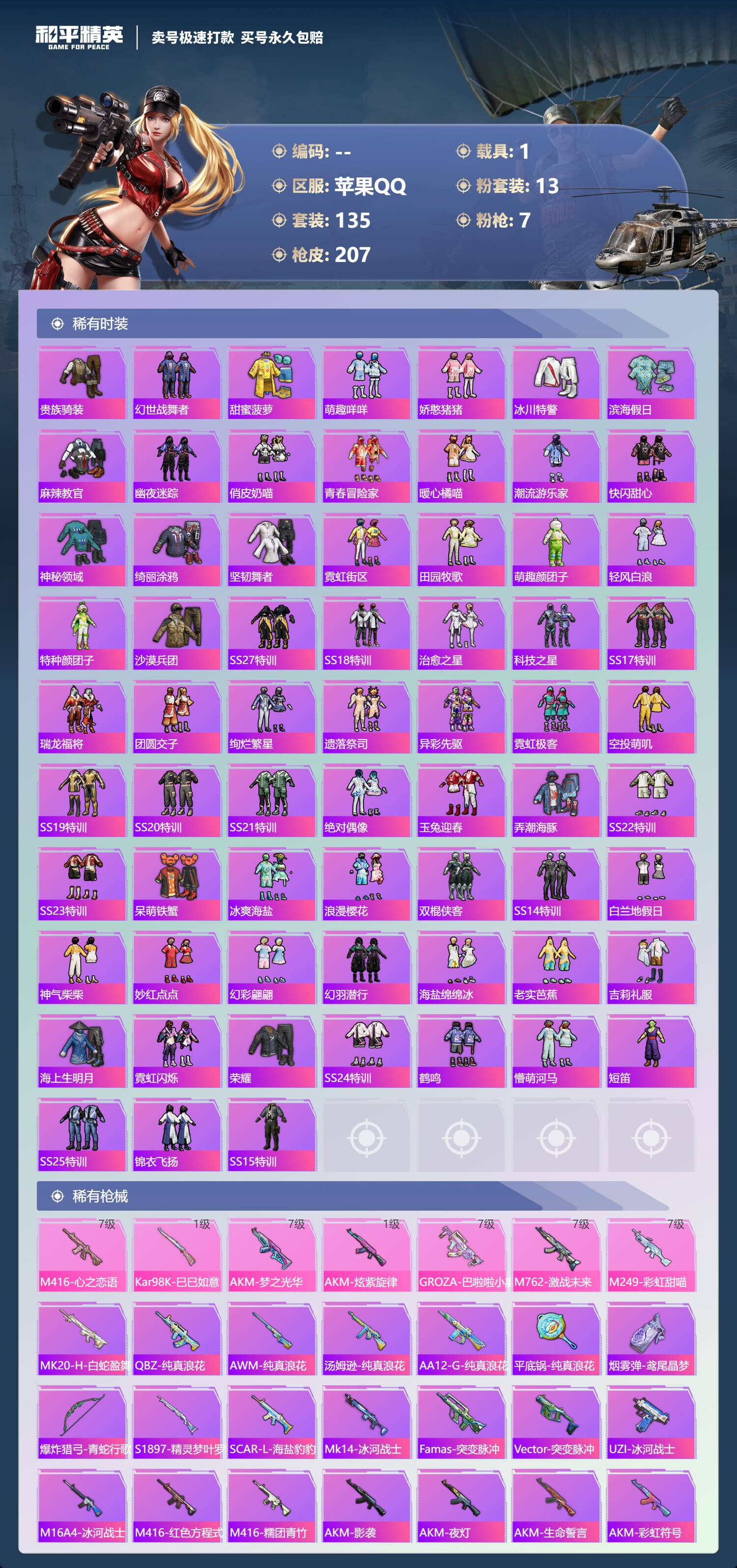 a3100/苹果QQ/-14王牌印记-13粉装-7特效枪-1载具-71791热力值-134套装-20