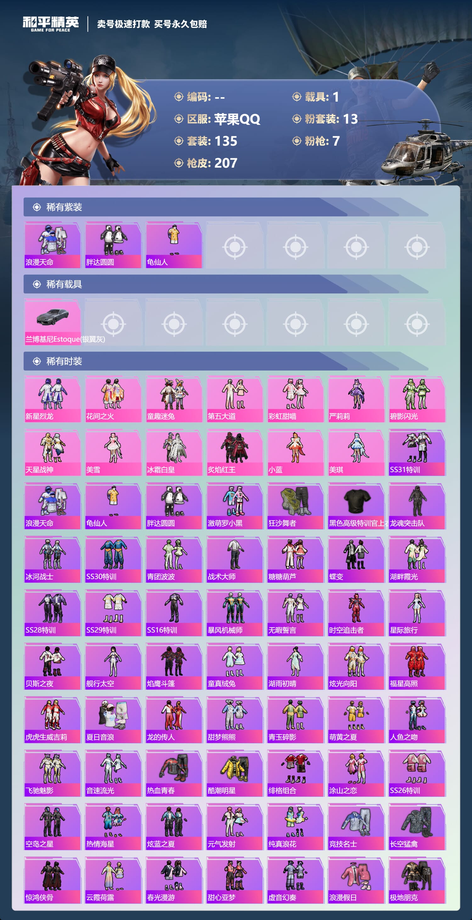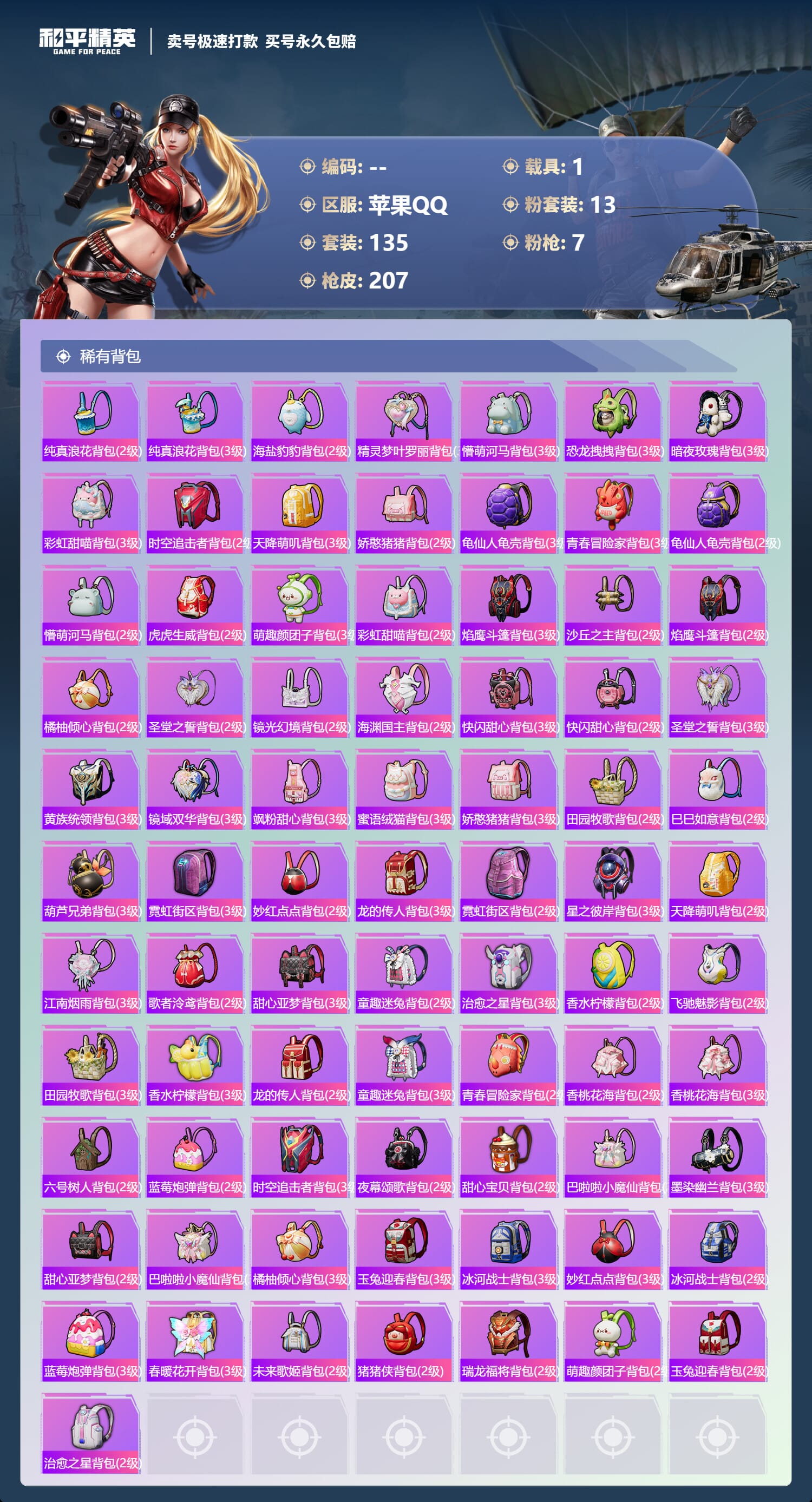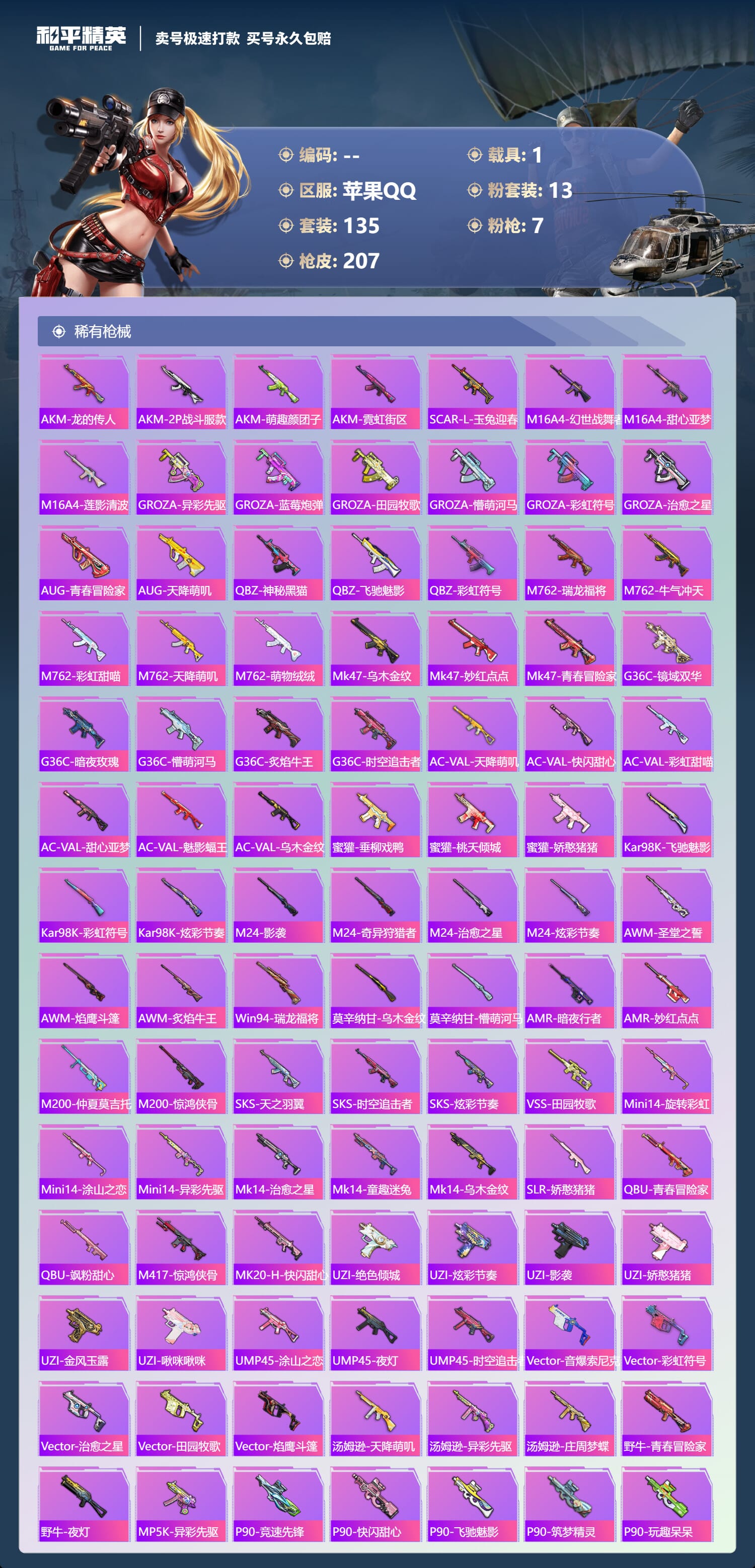 a3100/苹果QQ/-14王牌印记-13粉装-7特效枪-1载具-71791热力值-134套装-20