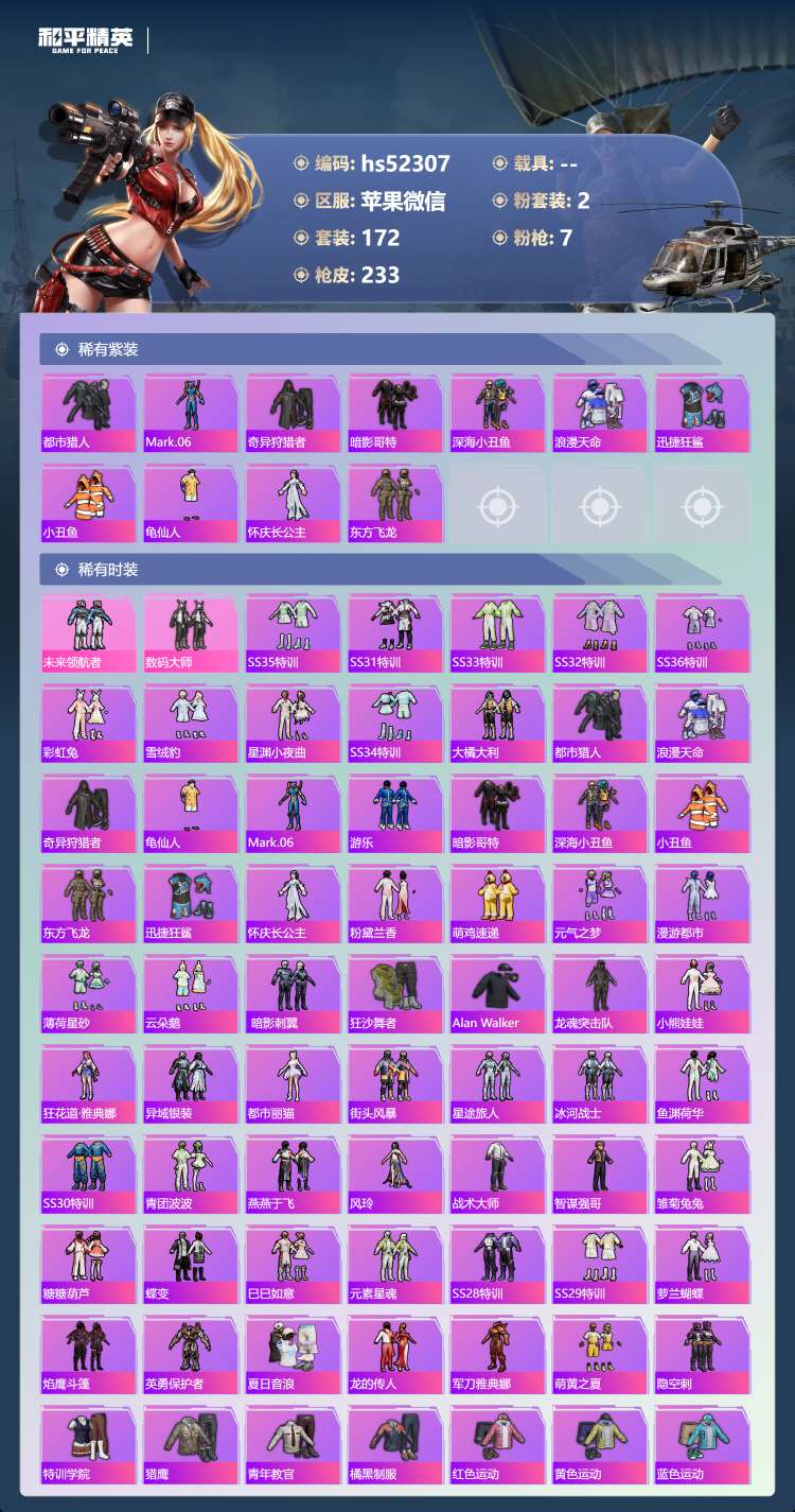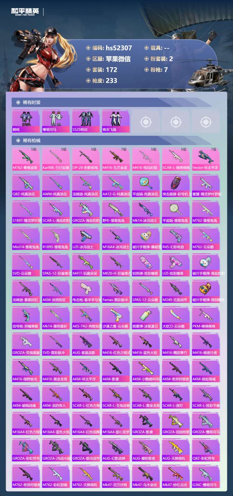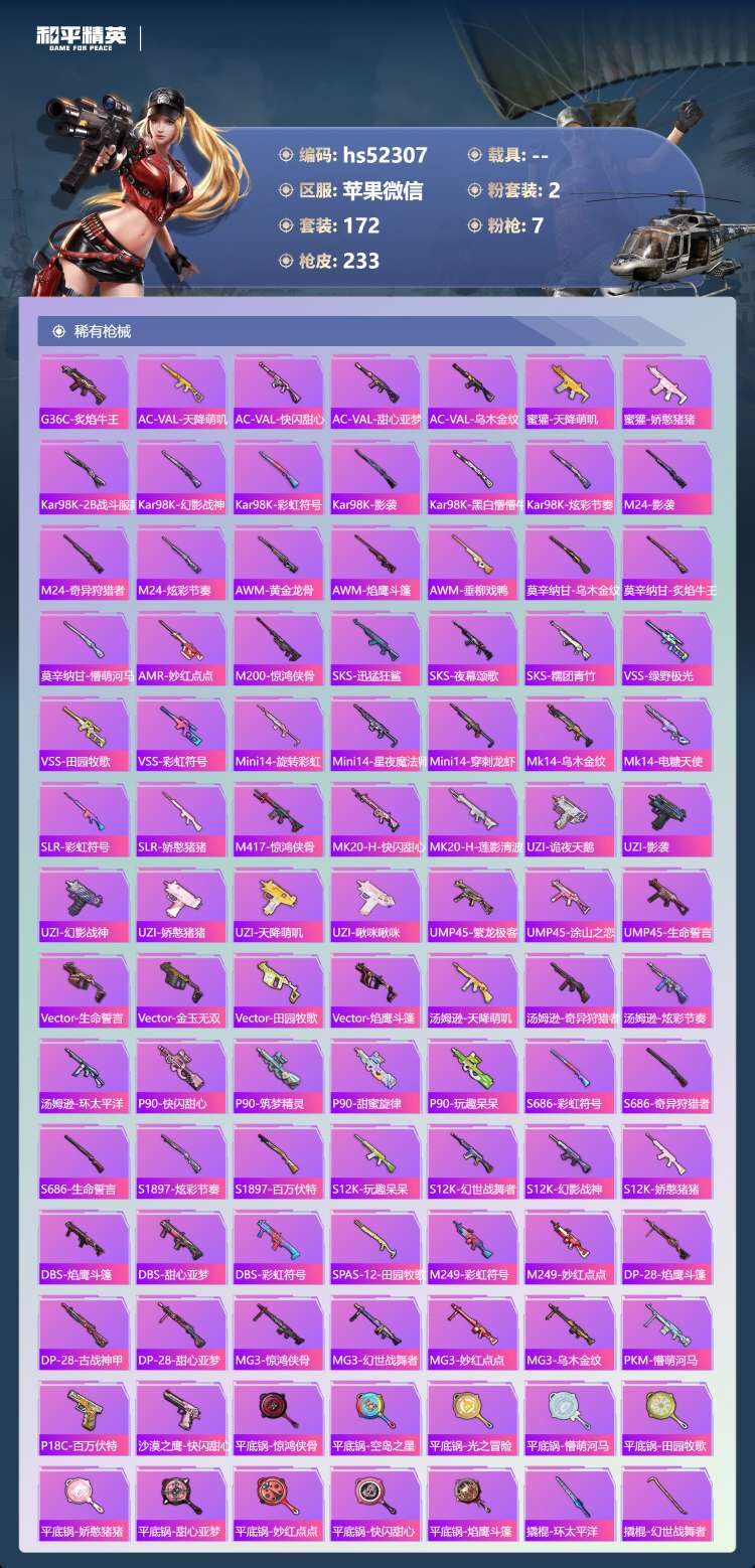 hs52307 苹果微-16王牌印记-2粉装-7特效枪-68836热力值-172套装-233枪皮-