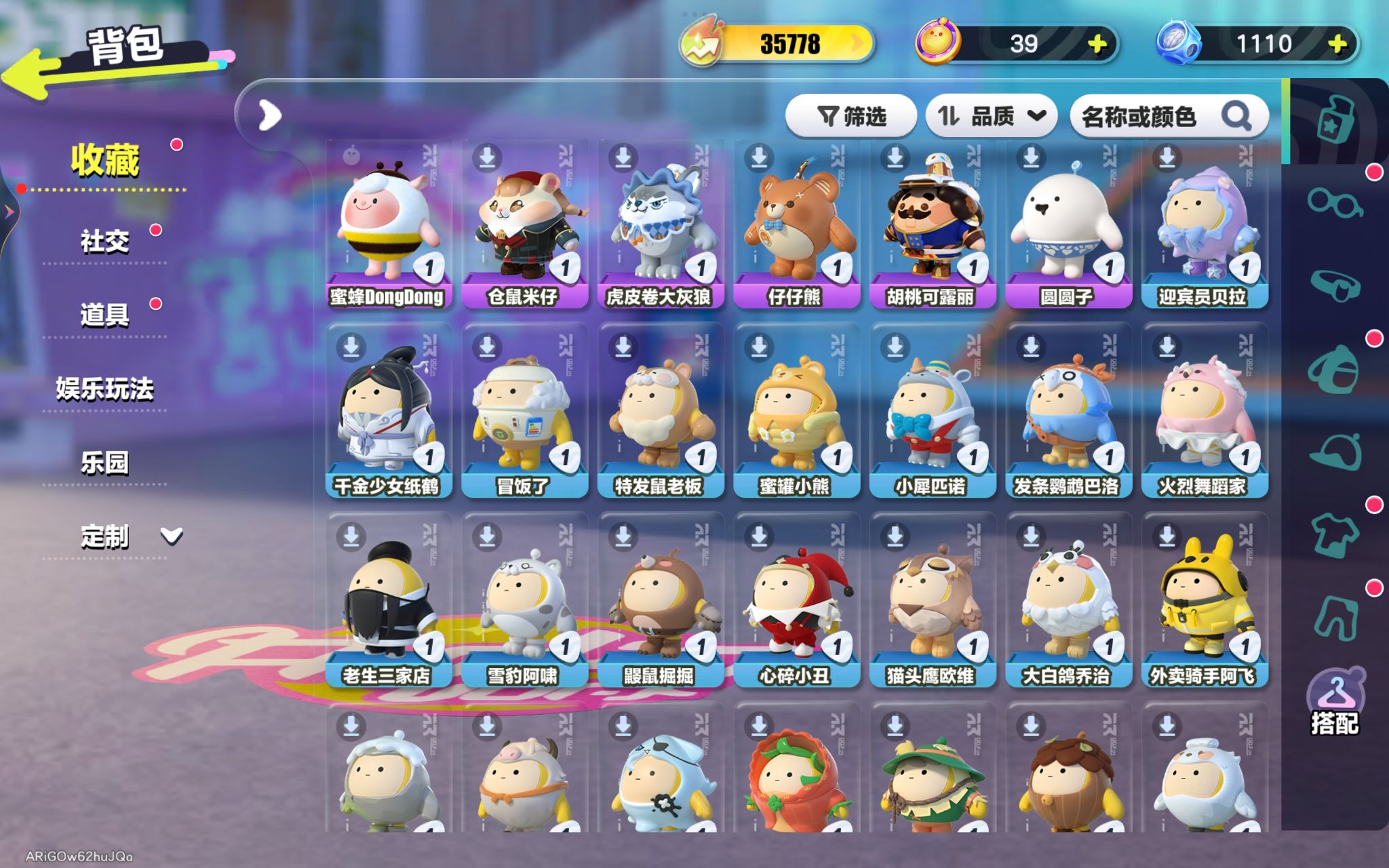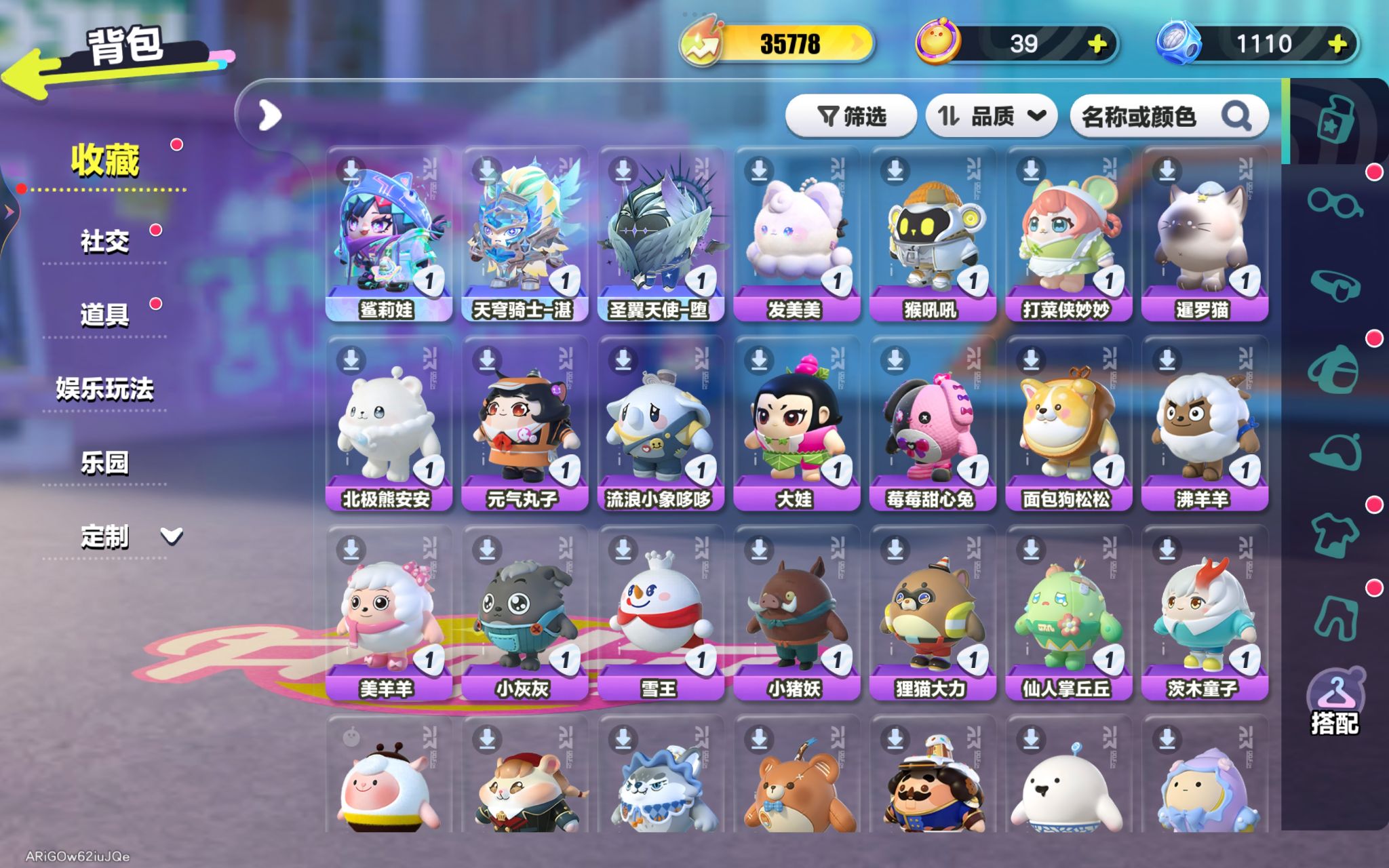 紫色套装:发美美,猴吼吼,打菜侠妙妙,暹罗猫,北极熊安安,元气丸子,流浪小象哆哆,大娃,莓莓甜心兔,面包狗松松,沸羊羊,美羊羊,小灰灰,雪王,小猪妖,狸猫大力,仙人掌丘丘,茨木童子,蜜蜂DongDong,仓鼠米仔,虎皮卷大灰狼,仔仔熊,胡桃可露丽,圆圆子,