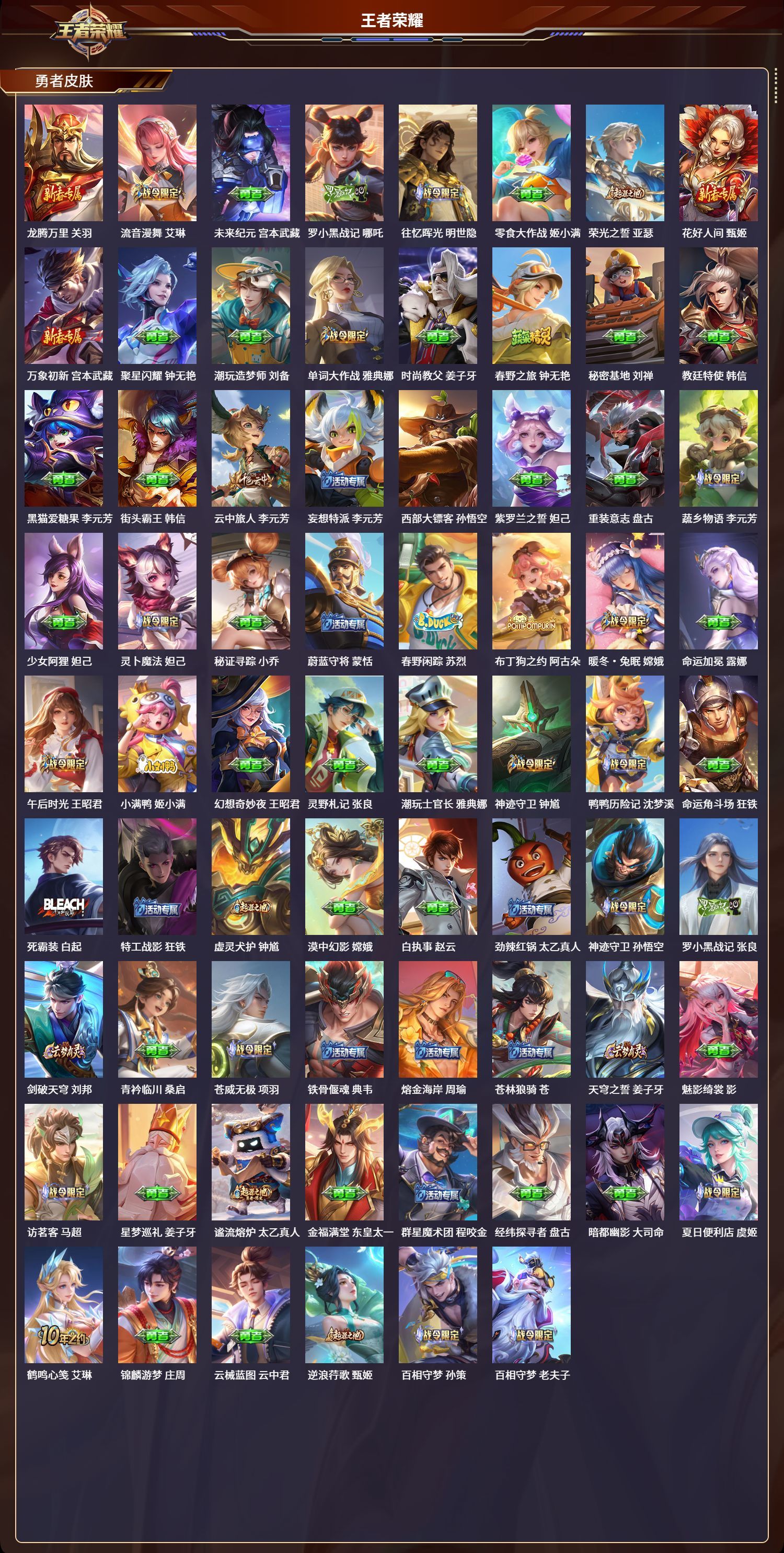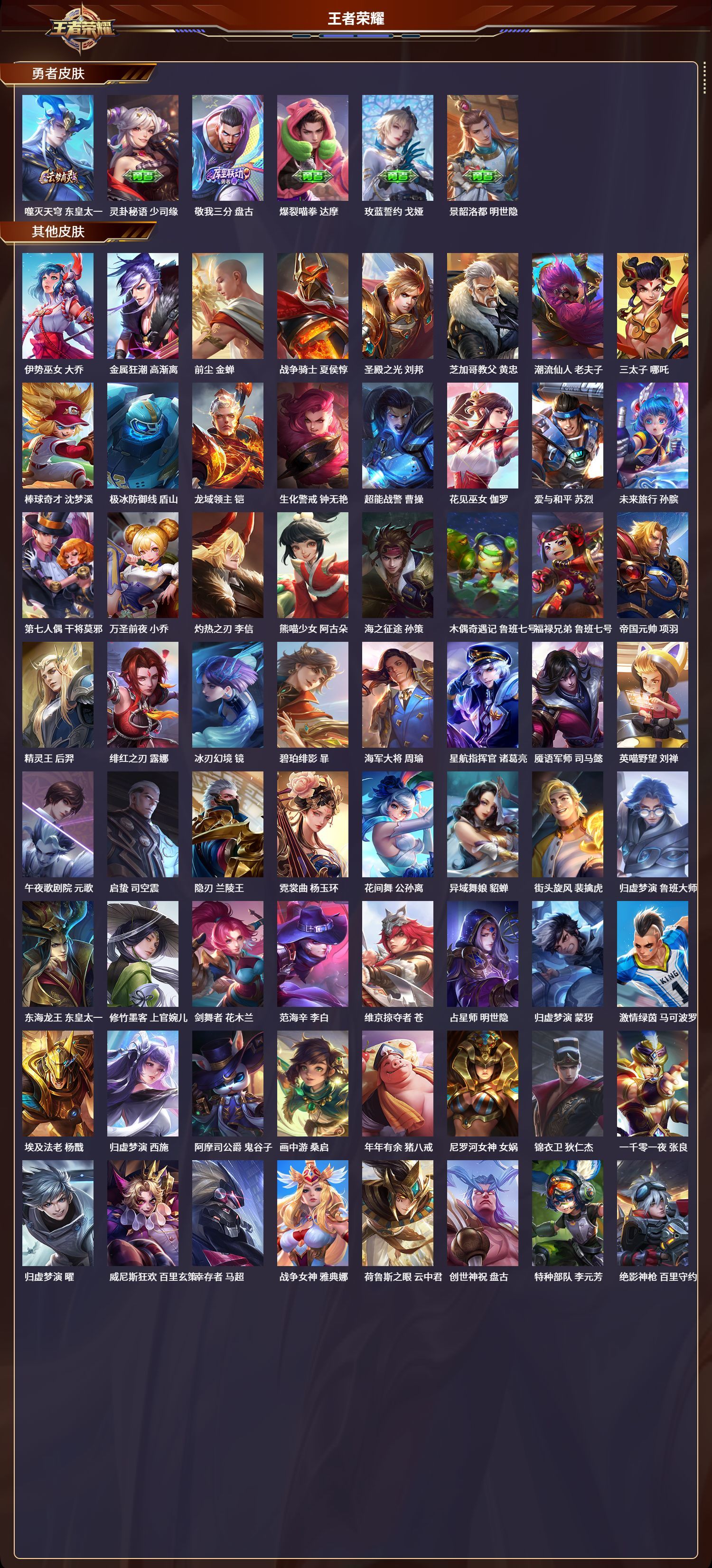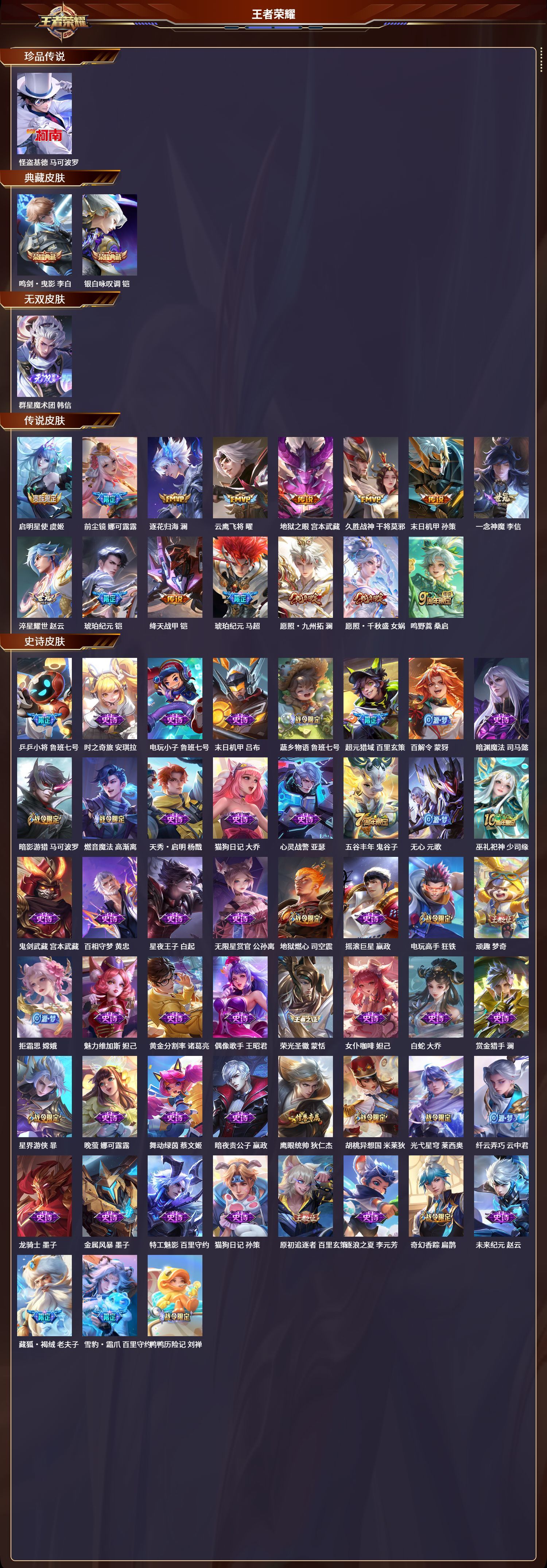 安卓QQ/荣耀王者/366皮肤/124英雄/2典藏/0珍品无双/1无双/1珍品传说/15传说/104