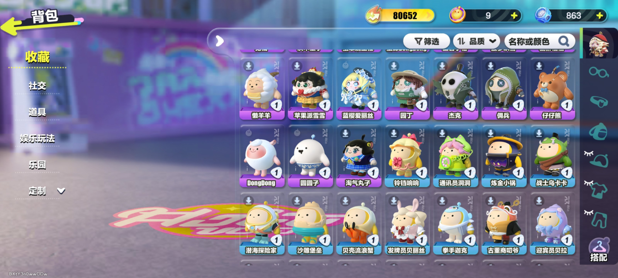 紫皮:鸭鸭 DongDong,蜜蜂 DongDong,DongDong,奶茶店阿噗,幽猎塞莉诺,大亨波利,波泡儿,石心船长苏勒,莓莓甜心兔,神兽嘲风,御狸奴,音乐家崔利,极光女神典