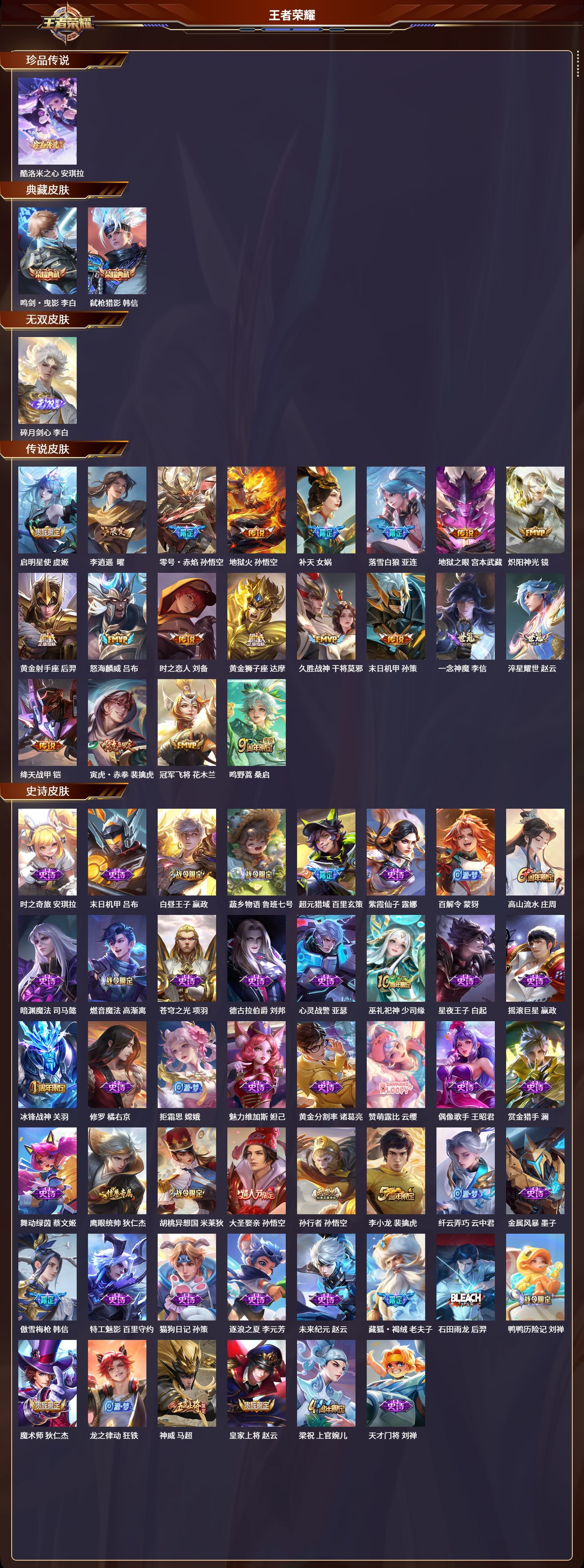 苹果QQ/永恒钻石/266皮肤/125英雄/2典藏/0珍品无双/1无双/1珍品传说/20传说/69史