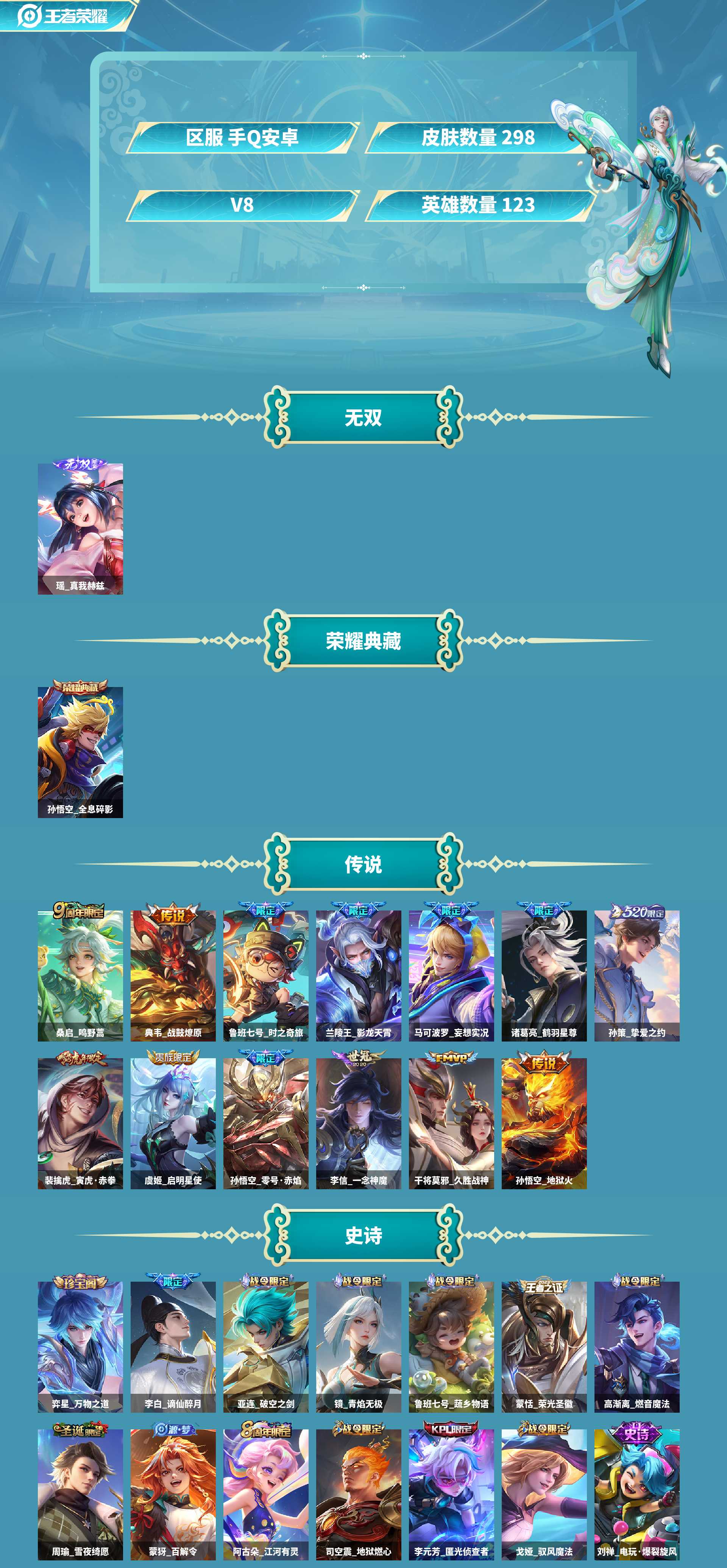 瑶无双+猴子典藏/皮肤数量298印记总数5V8至尊星耀暂时不