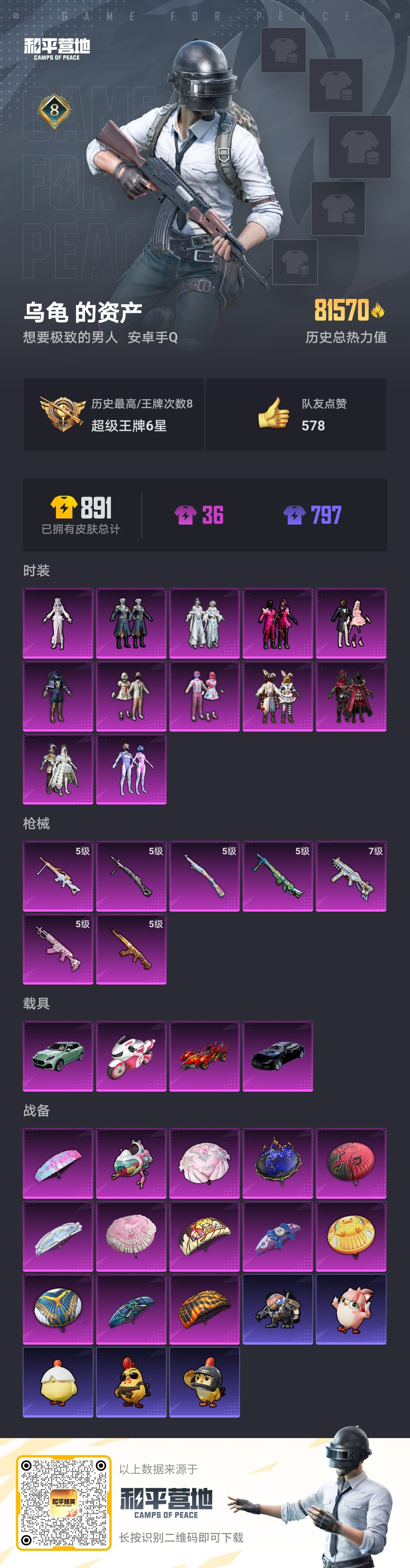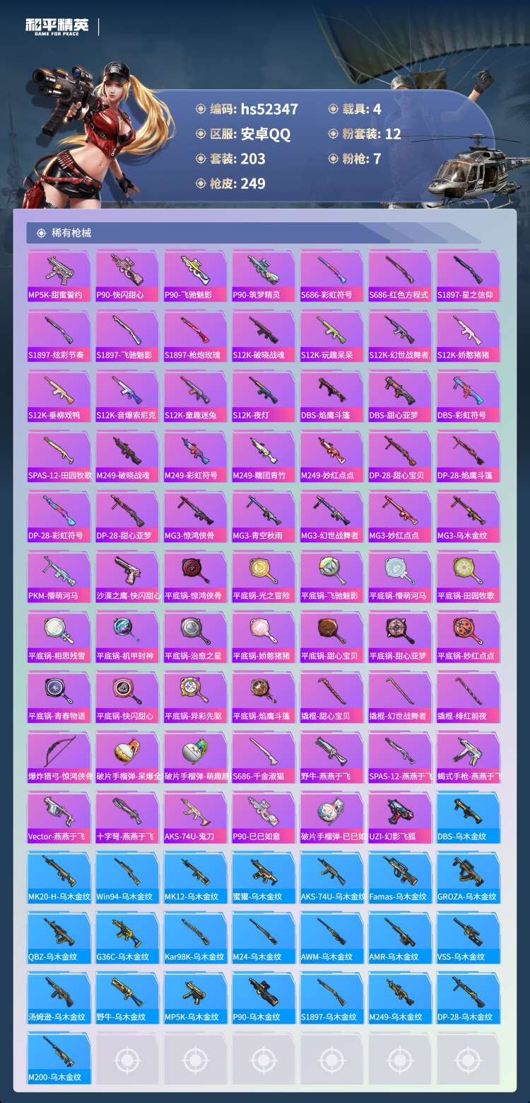 hs52347 安卓手Q-8王牌印记-12粉装-7特效枪-4载具-81785热力值-203套装-24