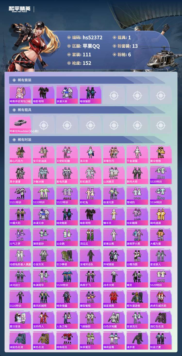 hs52372 苹果手Q-9王牌印记-13粉装-6特效枪-1载具-56441热力值-111套装-15