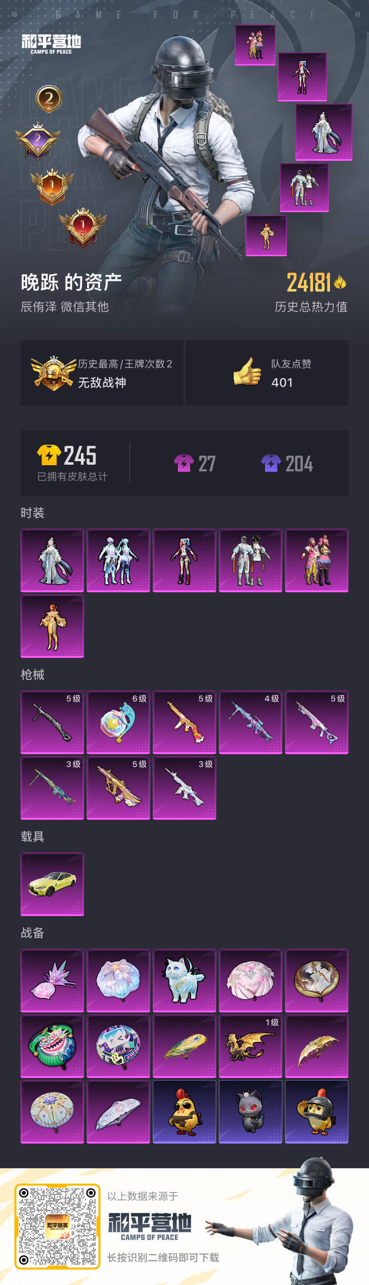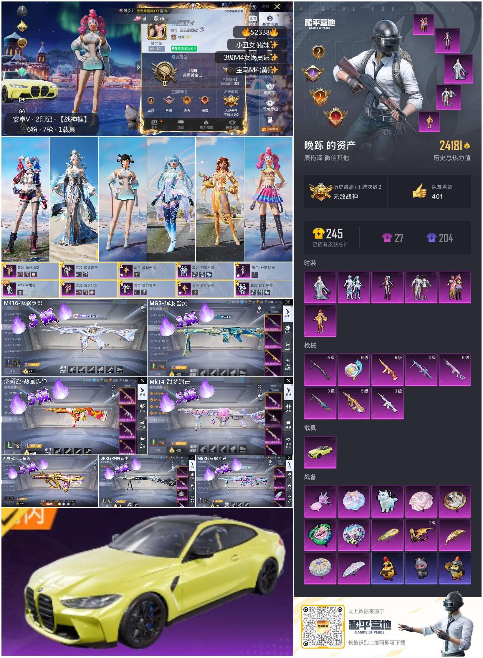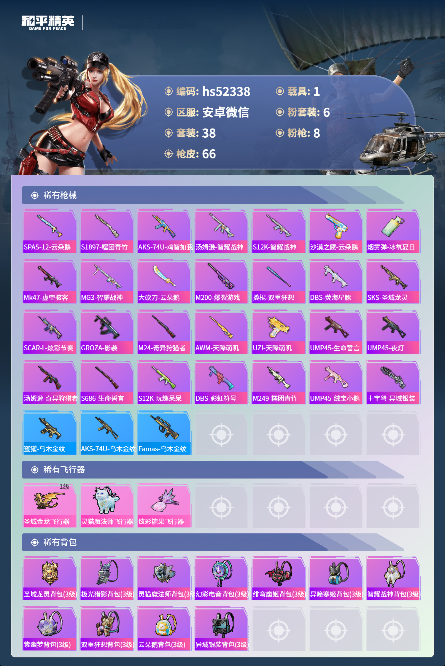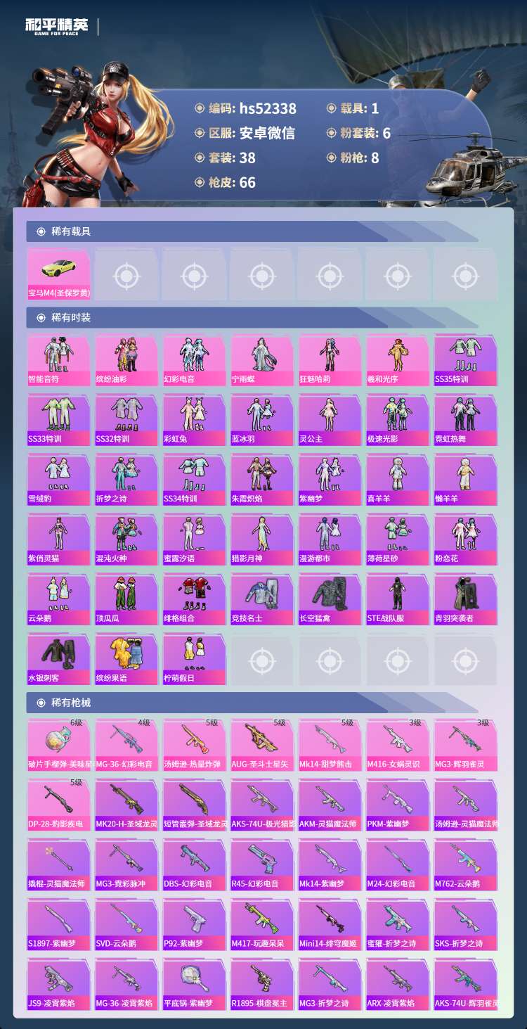 hs52338 安卓微-2王牌印记-有战神框-6粉装-8特效枪-1载具-24181热力值-38套装