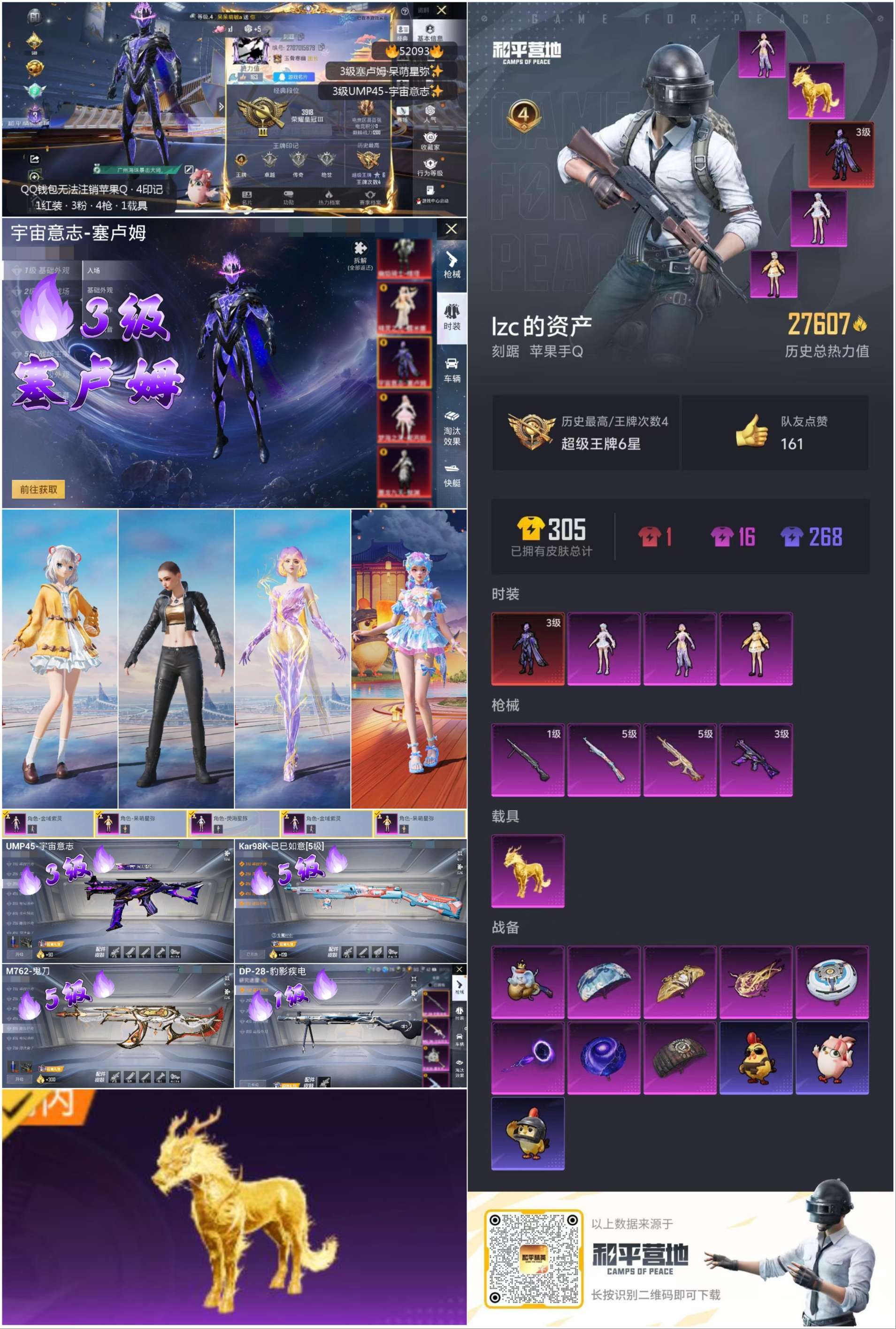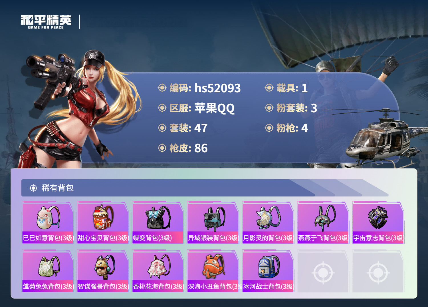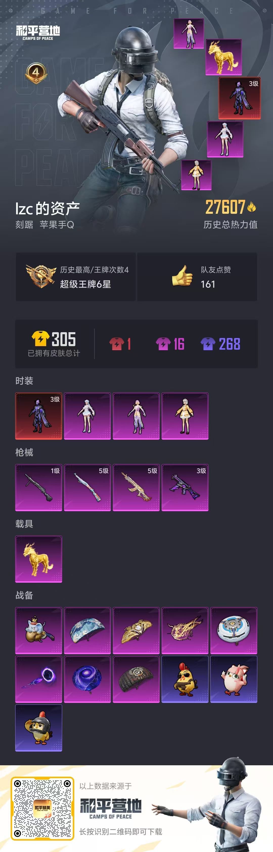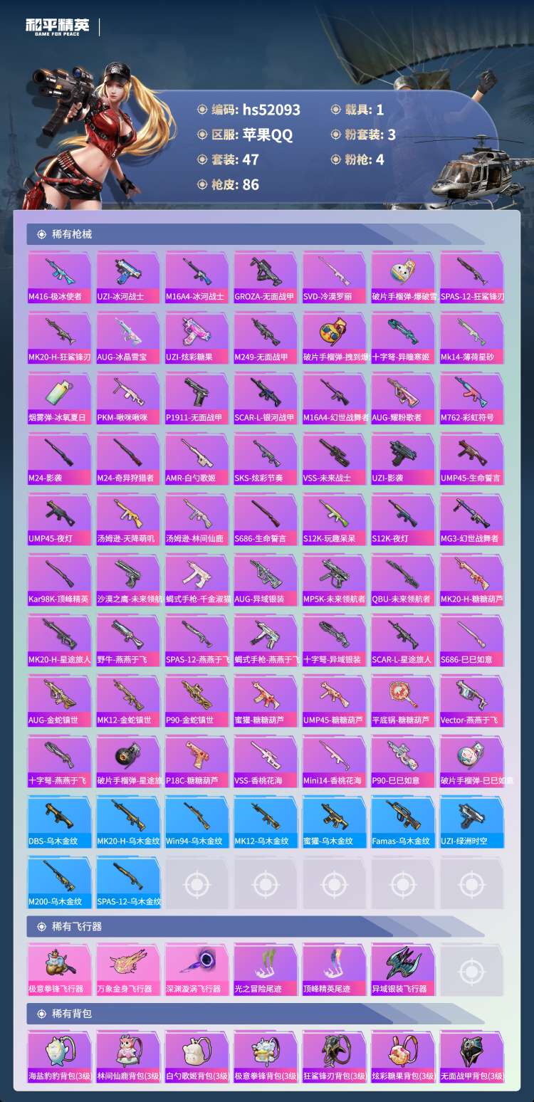 hs52093 苹果手Q-4王牌印记-1红装-3粉装-4特效枪-1载具-27607热力值-47套装-