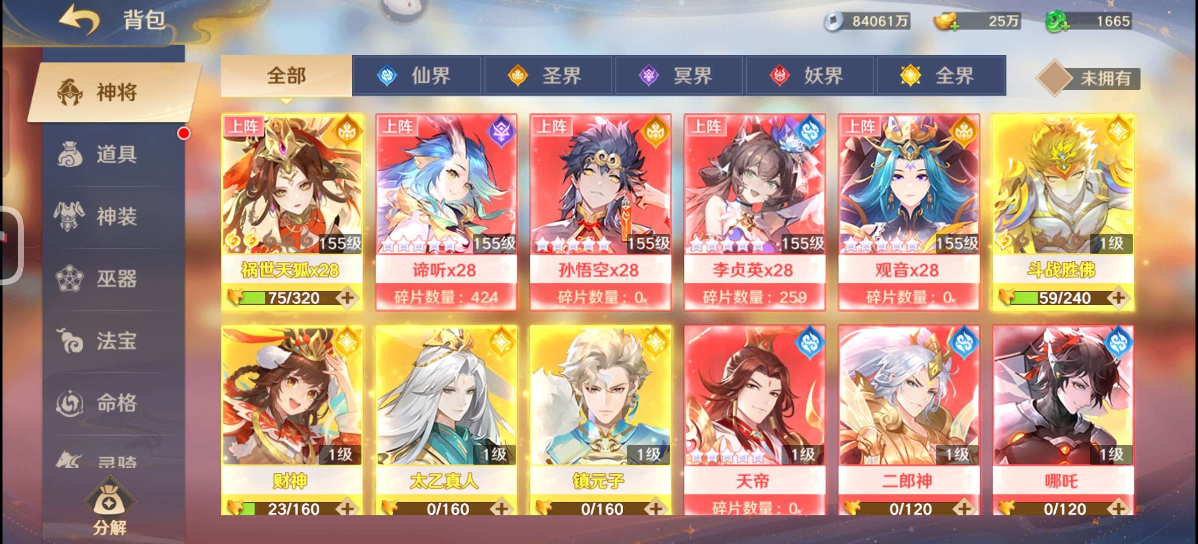 五金将,四星须尽欢,六觉醒荒兽,三个先天至宝,命格满图鉴,铭文技能一堆,法术都有,神通道具足够