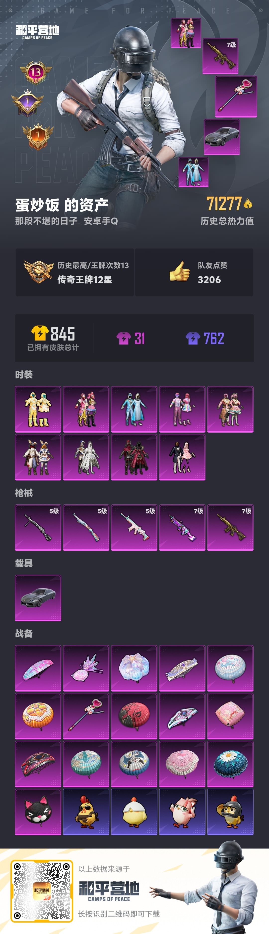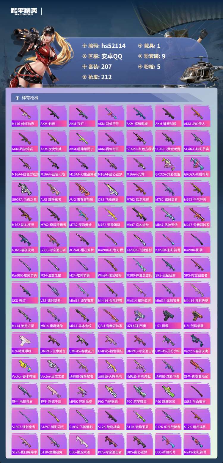 hs52114 安卓手Q-13王牌印记-9粉装-5特效枪-1载具-71277热力值-207套装-21