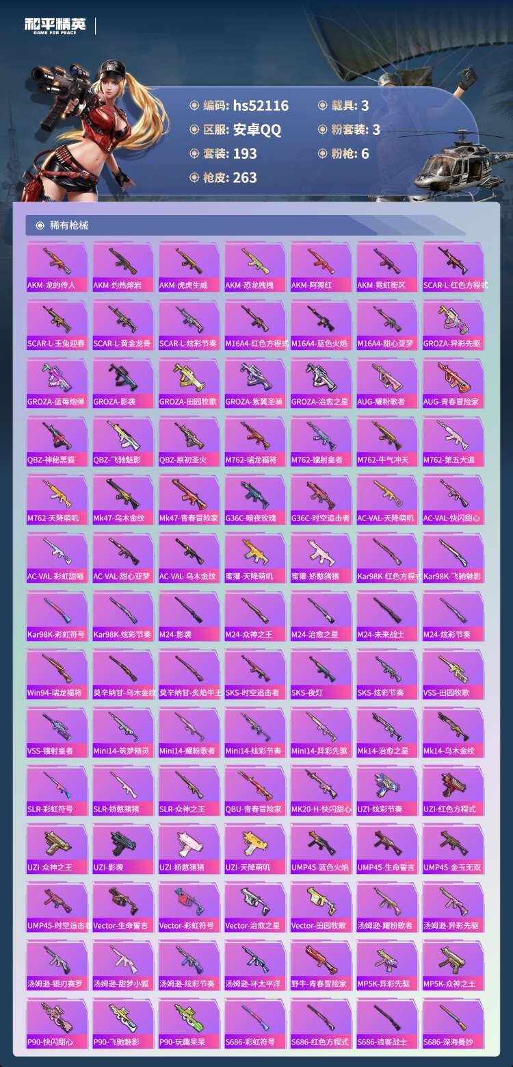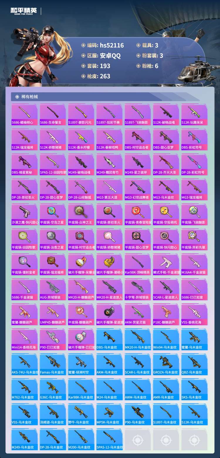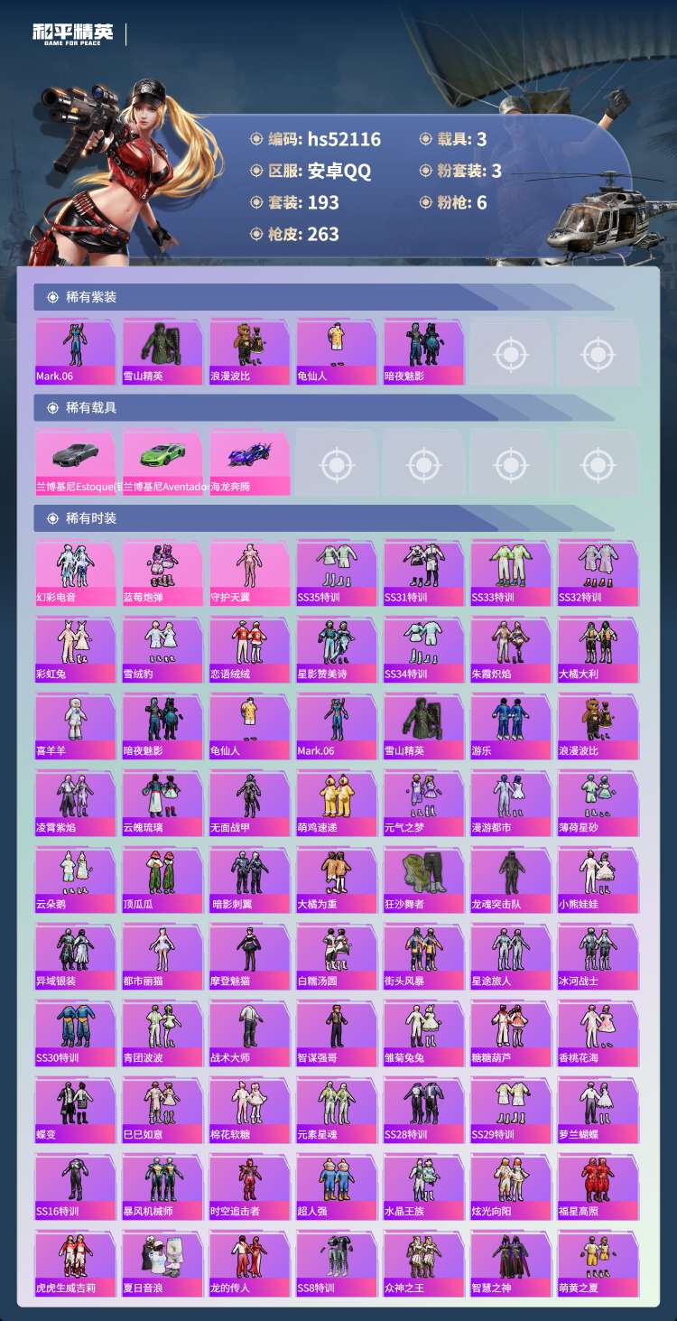 hs52116 安卓手Q-19王牌印记-3粉装-6特效枪-3载具-80655热力值-193套装-26