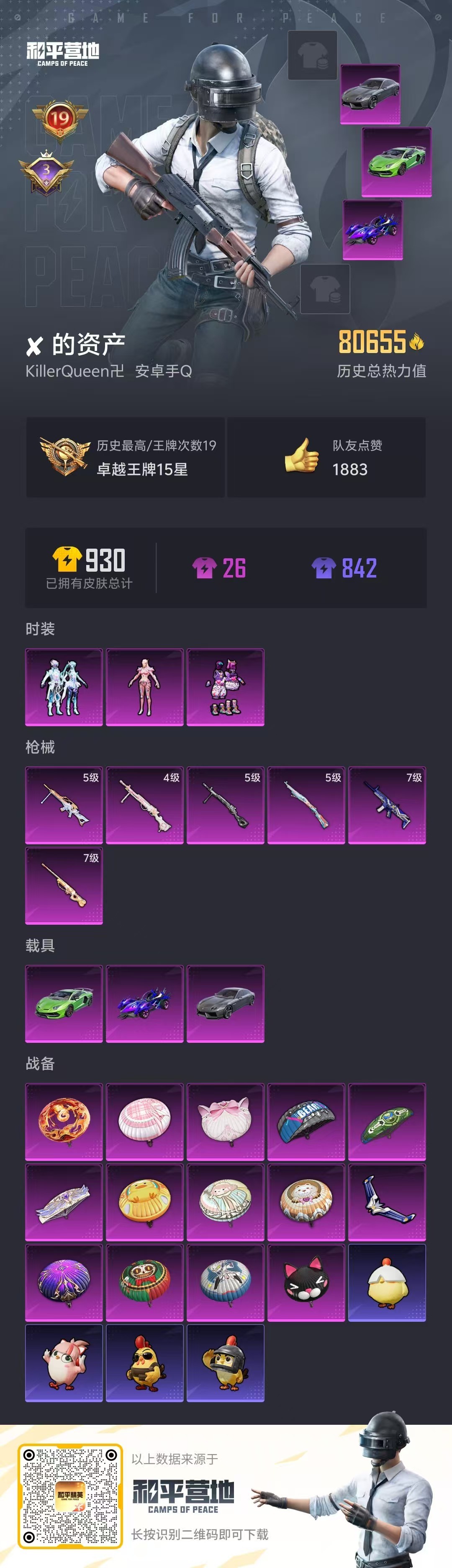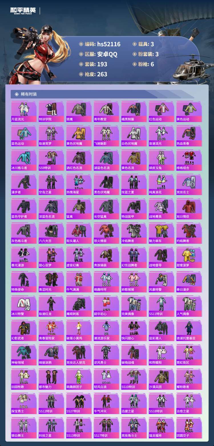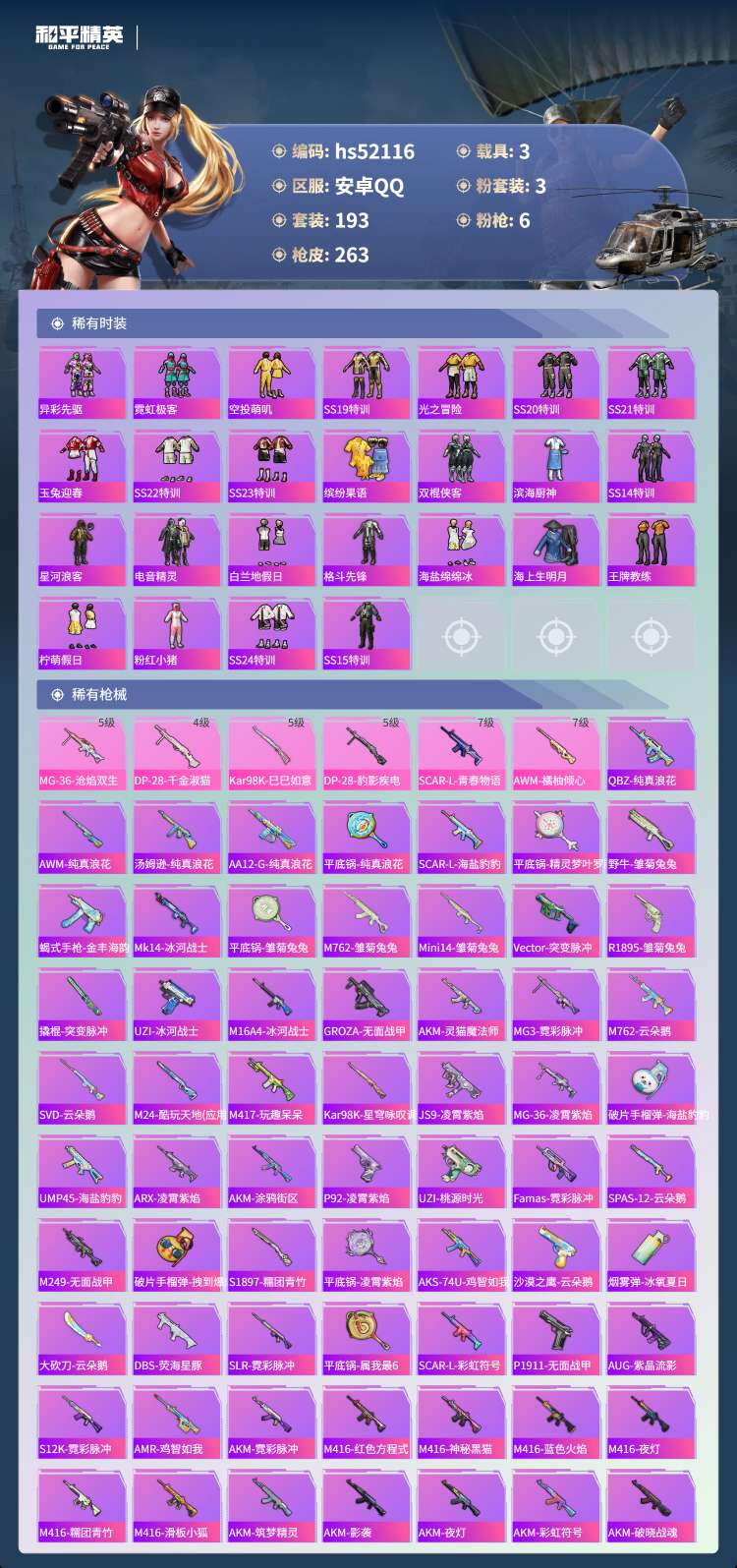 hs52116 安卓手Q-19王牌印记-3粉装-6特效枪-3载具-80655热力值-193套装-26