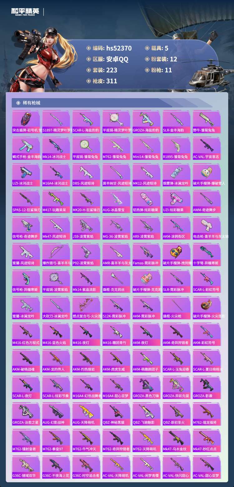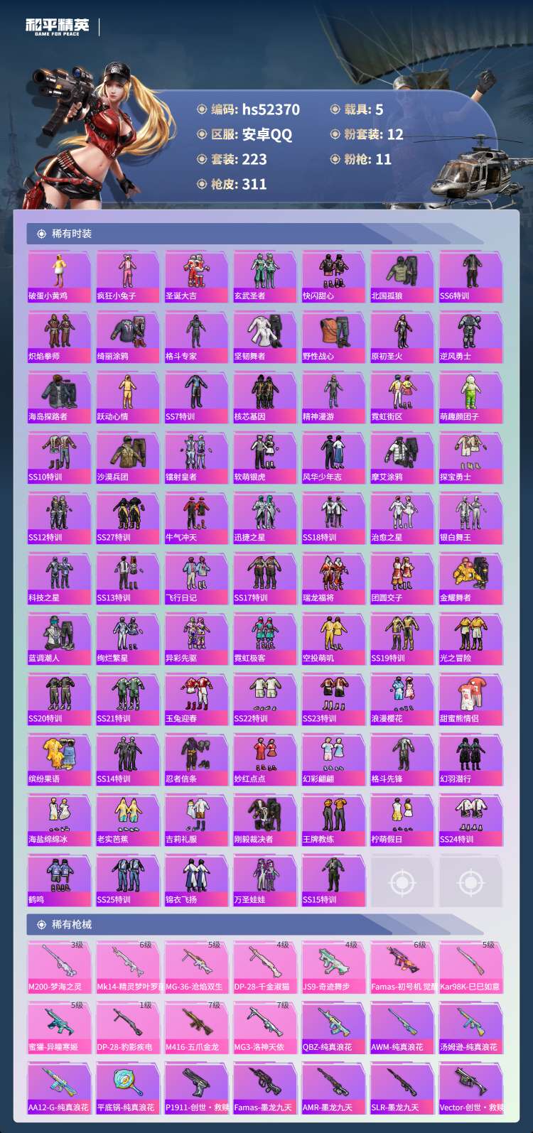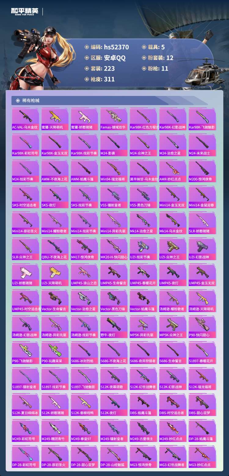 hs52370 安卓手Q-16王牌印记-1红装-12粉装-11特效枪-5载具-111954热力值-2