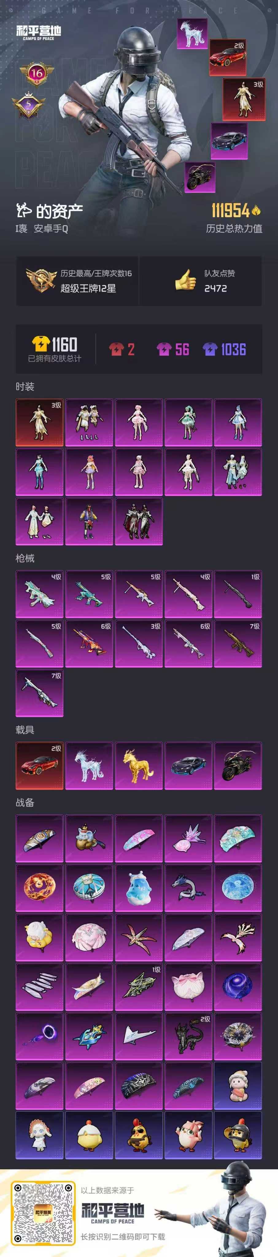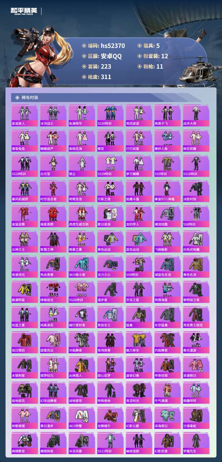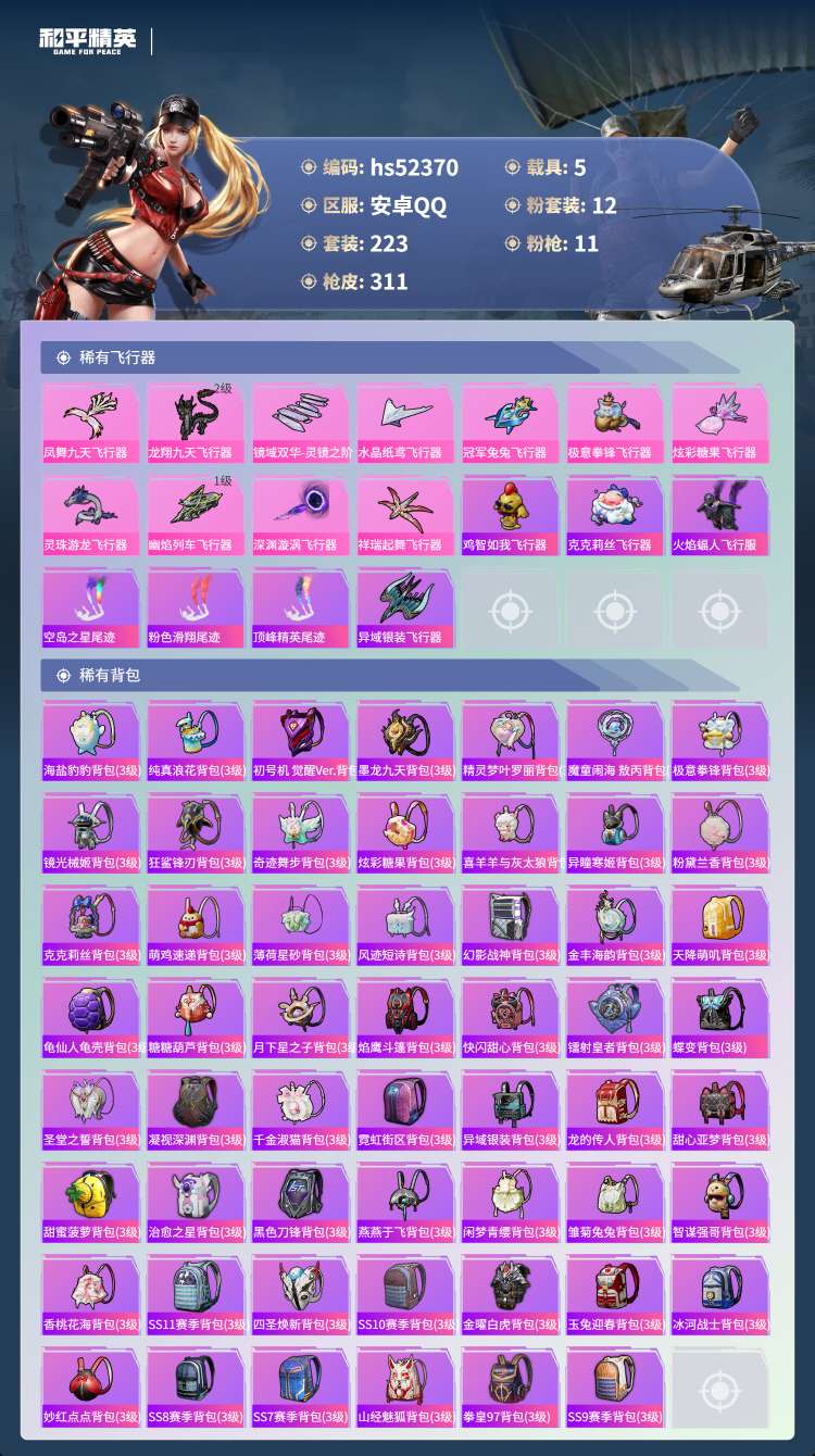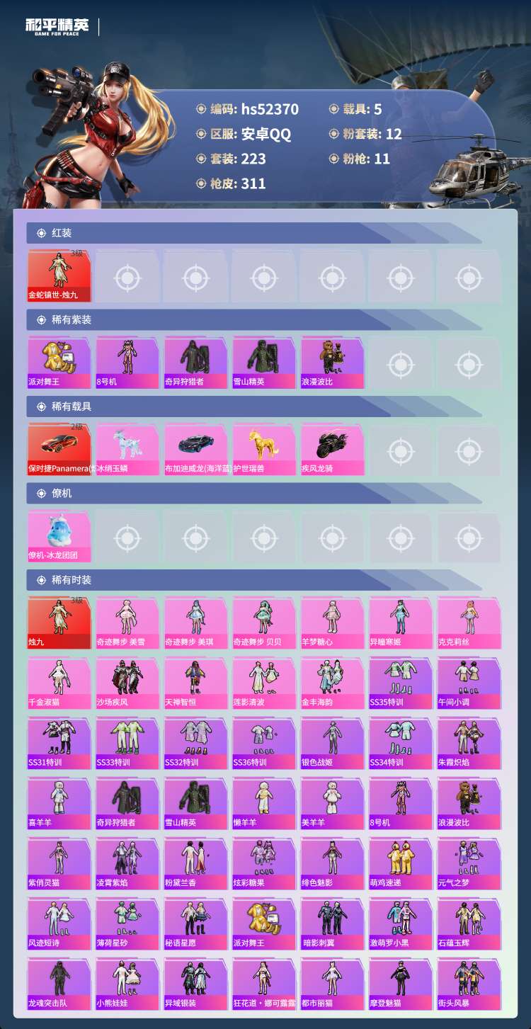 hs52370 安卓手Q-16王牌印记-1红装-12粉装-11特效枪-5载具-111954热力值-2