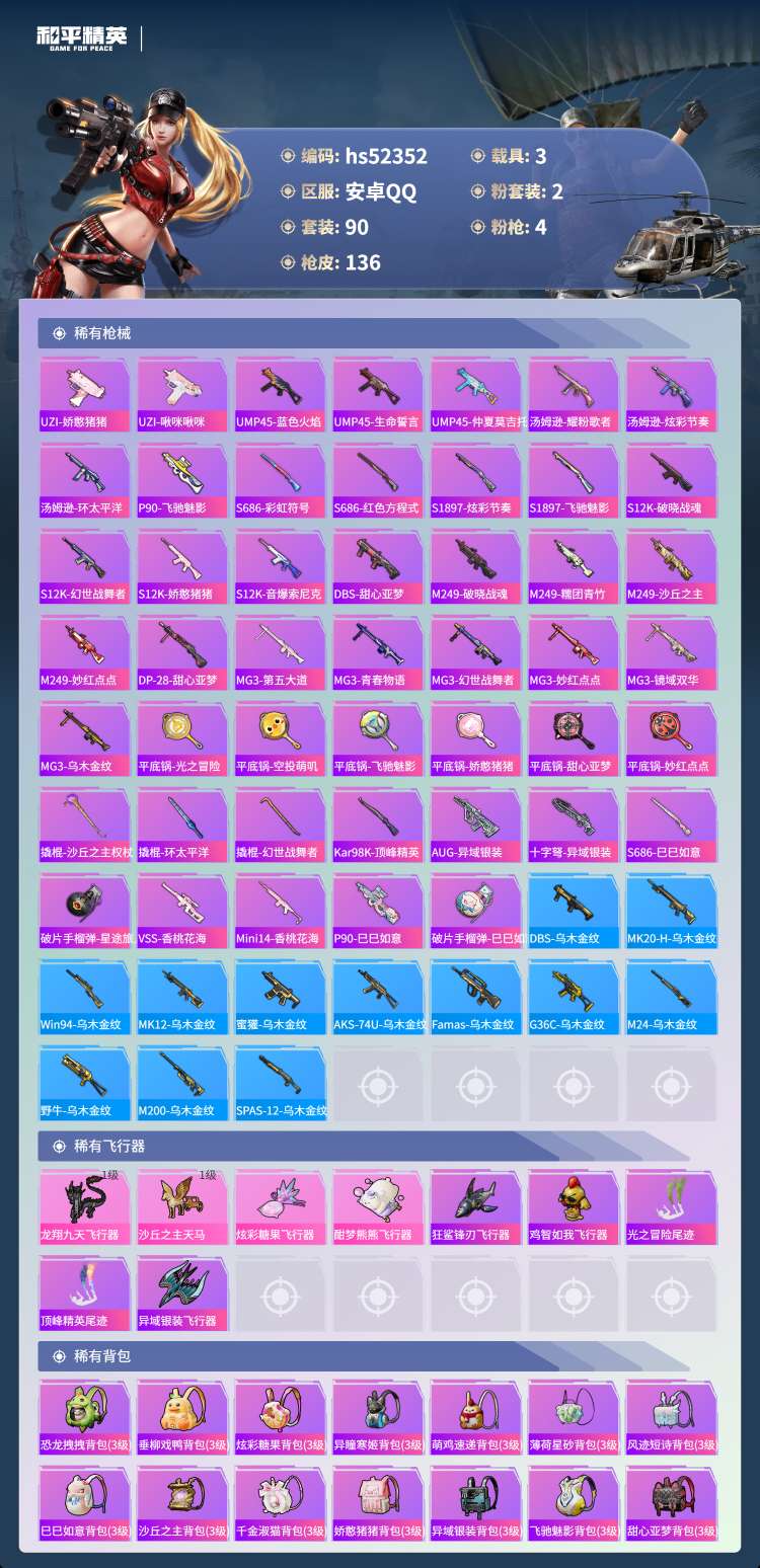 hs52352 安卓手Q-6王牌印记-2粉装-4特效枪-3载具-42278热力值-90套装-136枪