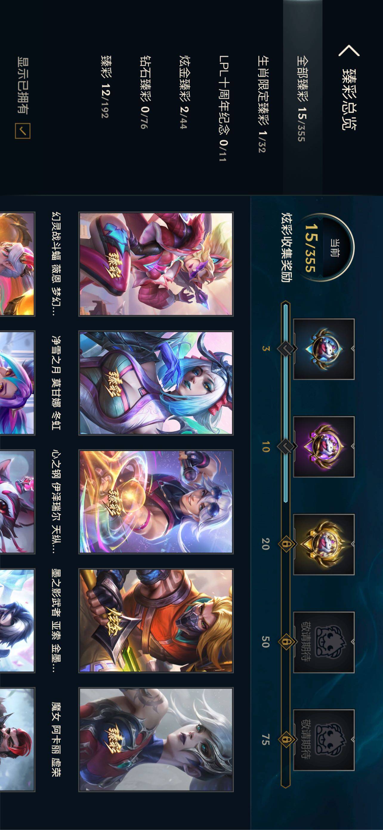 【臻彩皮肤】:天龙之子卡莎飞龙乘云,冠军之箭艾希凯旋圣装,墨之影武者亚索金墨耀影,星之守护者金克丝黑洞,幻灵战斗蝠薇恩梦幻强袭,霸天巨兽雪崩墨菲特,魔女阿卡丽虚荣,净雪之月莫甘娜冬虹,红莲之刃锐雯,心之钢伊泽瑞尔天纵才华