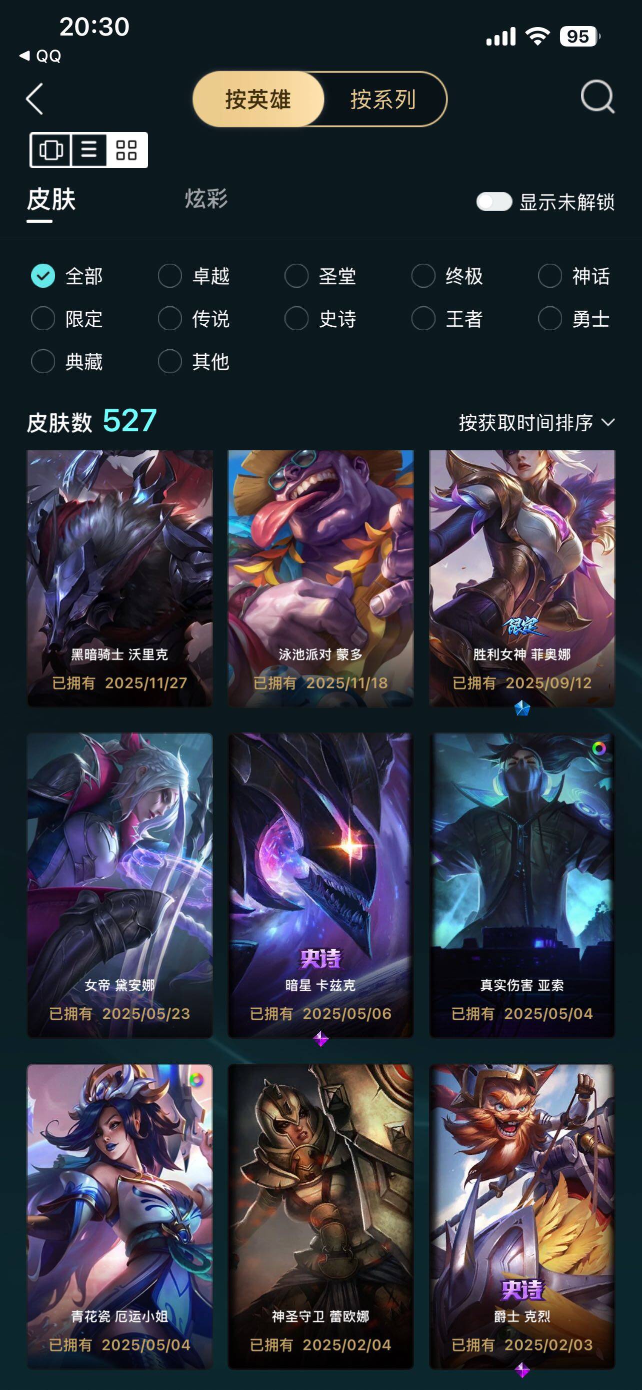 黄金段位-172英雄-527皮肤-257炫彩-2终极-5神话-105限定-47传说-127史诗