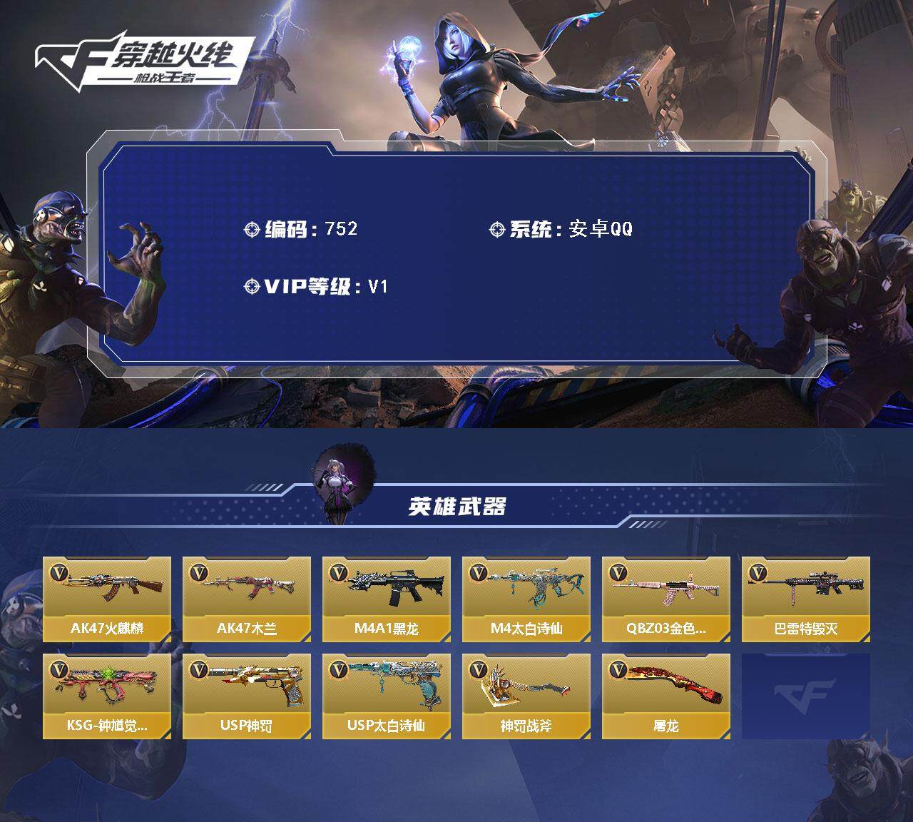 【英雄武器】:AK47-火麒麟,AK47-木兰,M4A1-黑龙,M4A1-太白诗仙,QBZ03-金色蔷薇,巴雷特-毁灭,KSG-钟馗觉醒,USP-神罚,USP-太白诗仙,神罚战斧,屠龙,太白诗仙扇