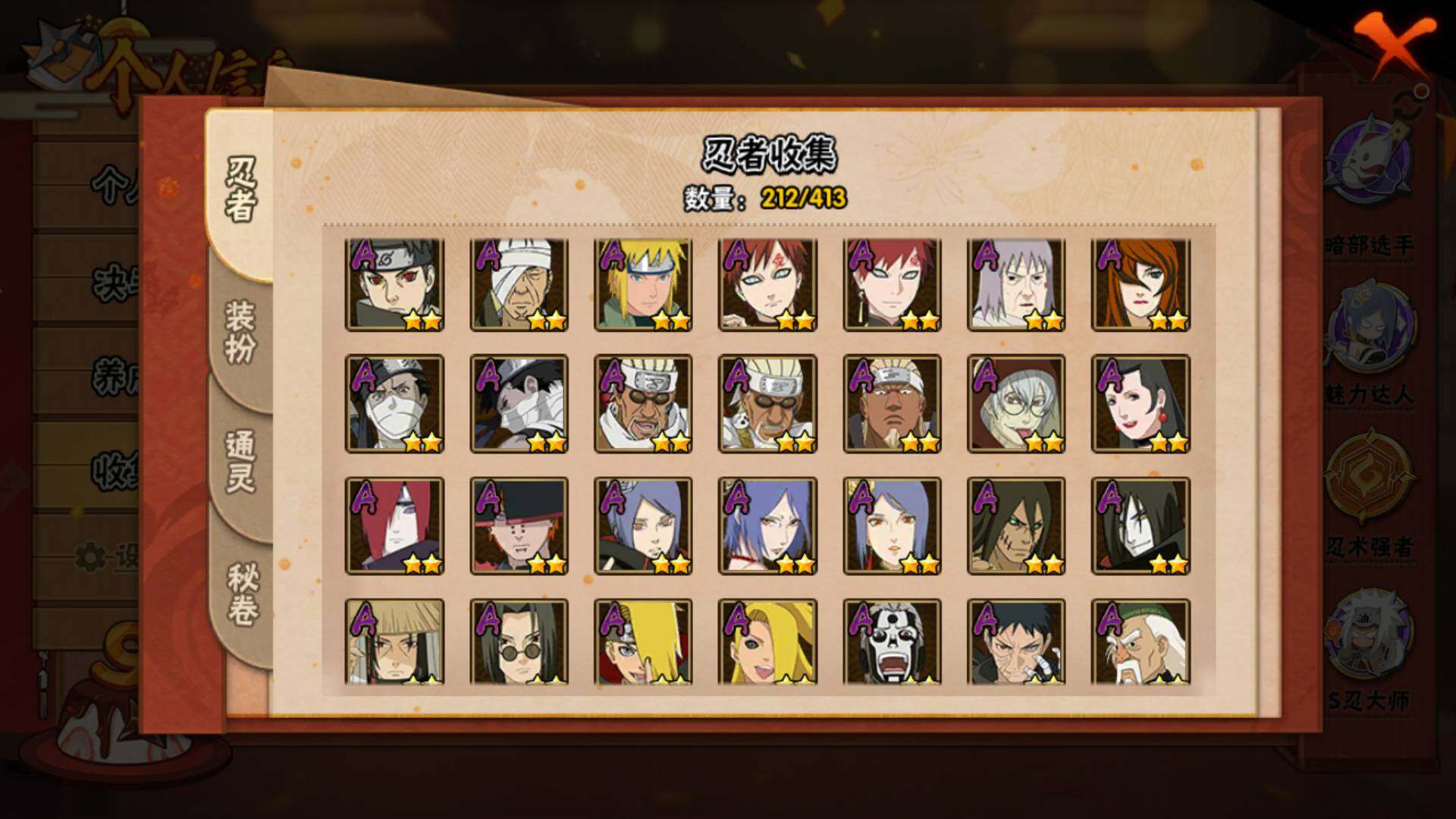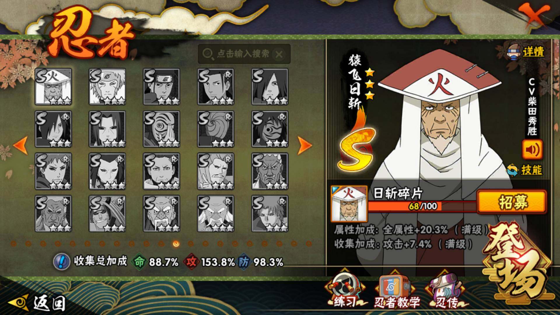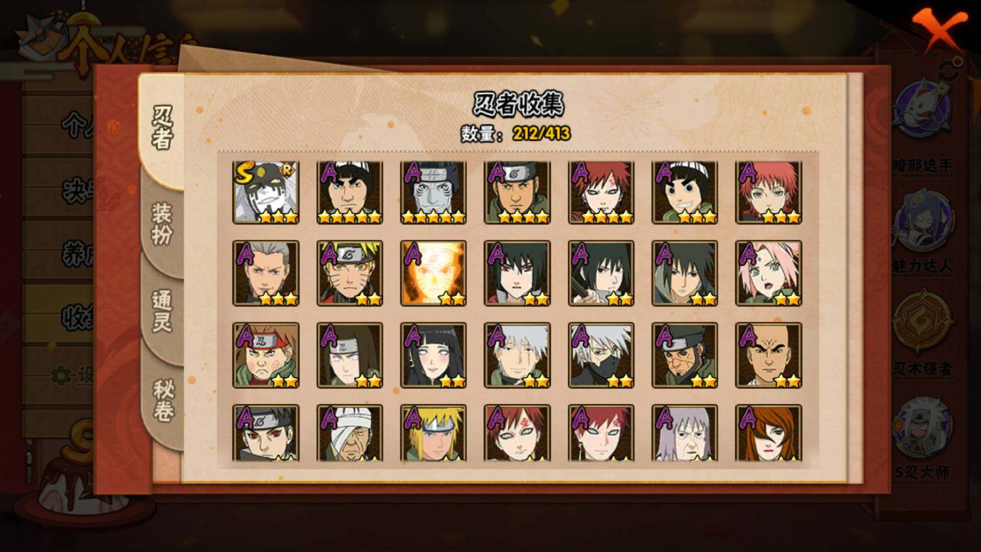 【S级忍者】:半藏「秽土转生」(3星),猿飞日斩「秽土转生」(3星),千手扉间「秽土转生」(3星),千手柱间「秽土转生」(3星),宇智波斑「秽土转生」(3星),宇智波斑「秽土转生·解」(3星),宇智波带土「忍界大战」(3星),艾「忍界大战」(3星),宇智波鼬「须佐能乎」(3星),宇智波止水「须