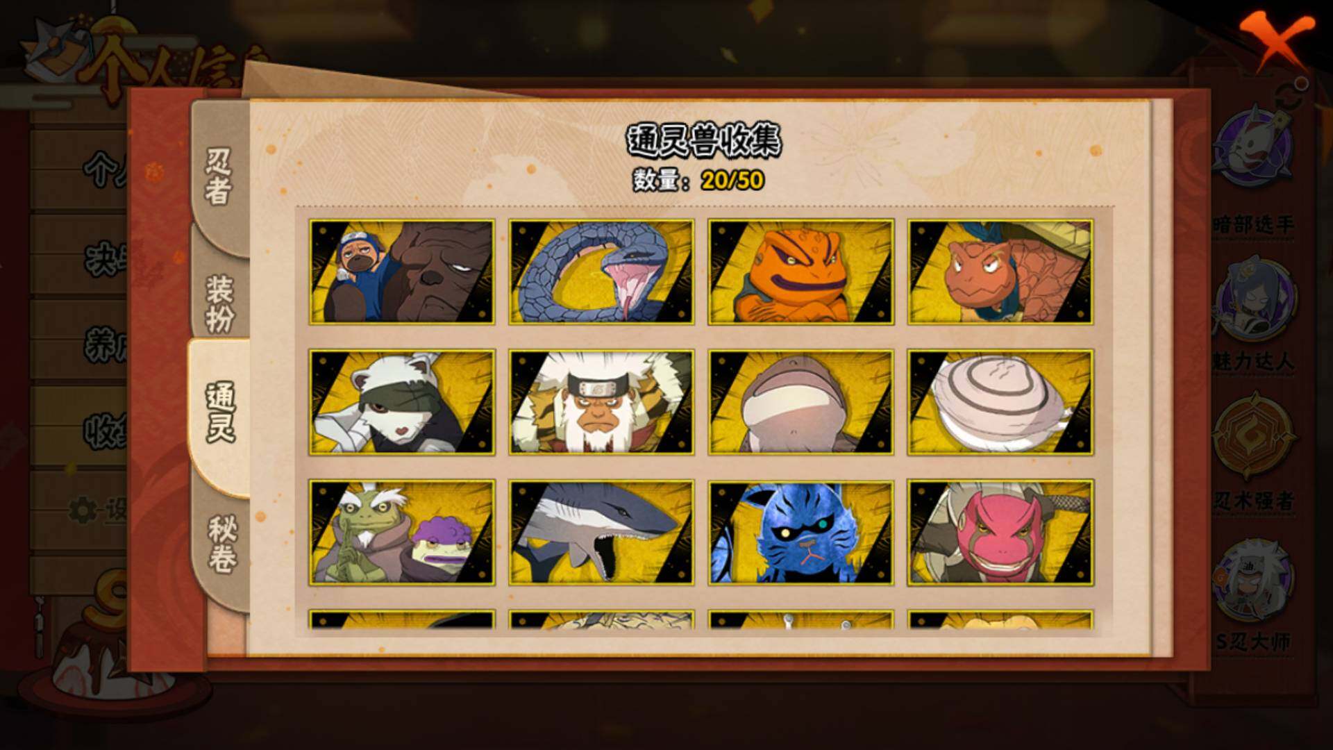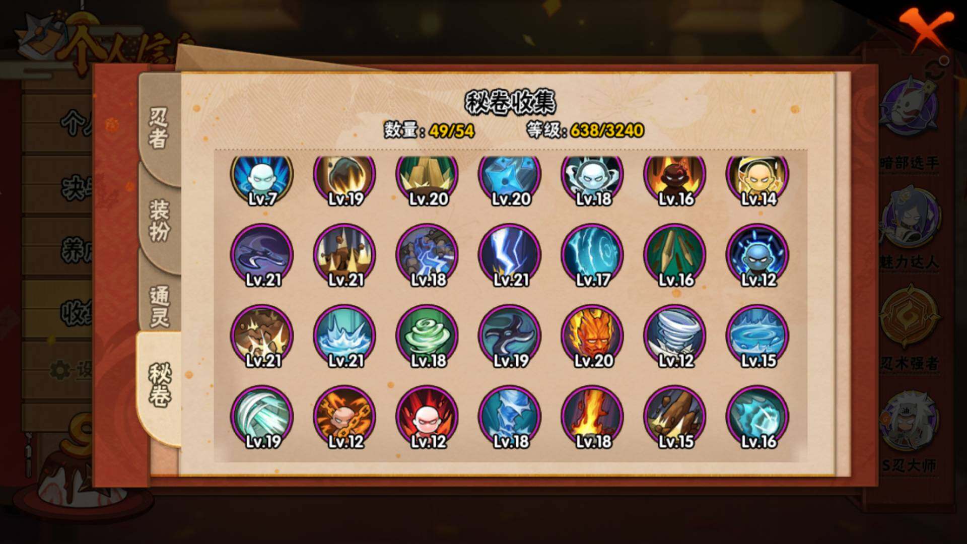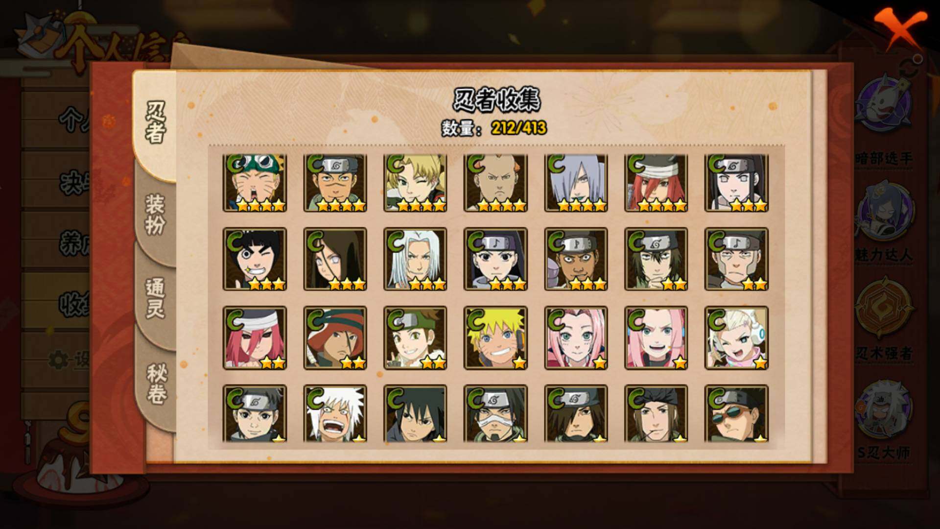 【S级忍者】:半藏「秽土转生」(3星),猿飞日斩「秽土转生」(3星),千手扉间「秽土转生」(3星),千手柱间「秽土转生」(3星),宇智波斑「秽土转生」(3星),宇智波斑「秽土转生·解」(3星),宇智波带土「忍界大战」(3星),艾「忍界大战」(3星),宇智波鼬「须佐能乎」(3星),宇智波止水「须