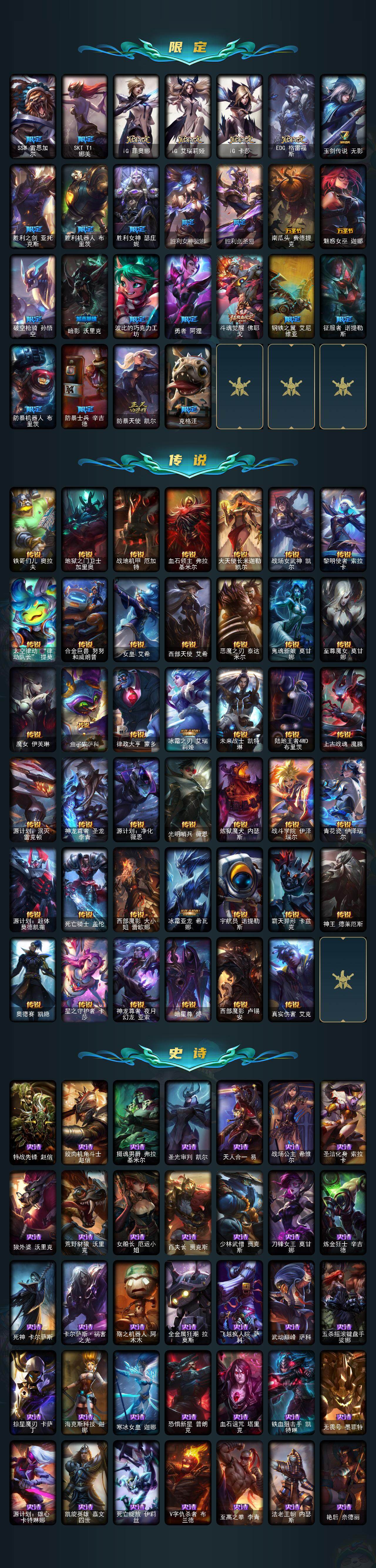 【LOLYT19】170英雄/364皮肤/4终极/16神话/47限定/8臻彩/56炫彩/41传说/70史诗/未定级/爱情之歌头像/至臻至高天凯尔/至臻剪纸仙灵希维尔/至臻魅惑女巫莫甘娜/至臻西部魔影伊芙琳/至臻海珀利安小队X09星环灵风迦娜/至臻灵能特工伊泽瑞尔/至臻黑夜使者凯隐/至臻KDAALLOUT卡莎/至臻幻灵战斗猫金克丝/至臻未来战士锤石/至臻未来战士锤石(2022)/天龙之子卡莎飞龙乘云/冰霜之刃艾瑞莉娅炫金/雾雨之刃锐雯/神龙尊者圣龙李青龙腾云起/山海绘卷科加斯朱红/可爱可爱粉红红布