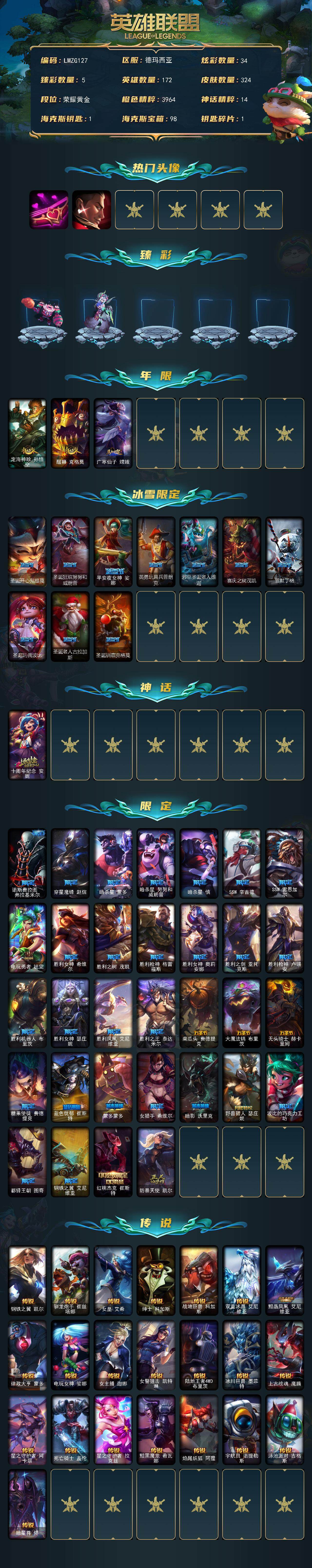 【LMZG127】172英雄/324皮肤/1神话/45限定/5臻彩/34炫彩/22传说/97史诗/黄金账号等级:370/爱情之歌头像/觅心游侠卢锡安头像/天龙之子卡莎飞龙乘云/可爱可爱粉红红布里茨/魔女阿卡丽虚荣/净雪之月莫甘娜冬虹/霸天异形卡兹克丛林灾厄/定海神珍孙悟空/醒狮克格莫/广寒仙子嫦娥/圣诞开心鬼提莫/圣诞狂欢努努和威朗普/平安夜女神娑娜/英勇玩具兵普朗克/邪恶圣诞老人维迦/喜庆之树茂凯/雪默丁格/圣诞玩偶波比/圣诞老人古拉加斯/圣诞驯鹿克格莫/十周年纪念安妮/诺斯费拉图弗拉基米尔/