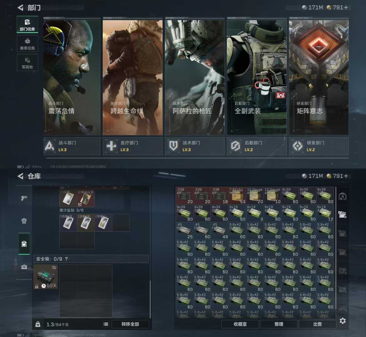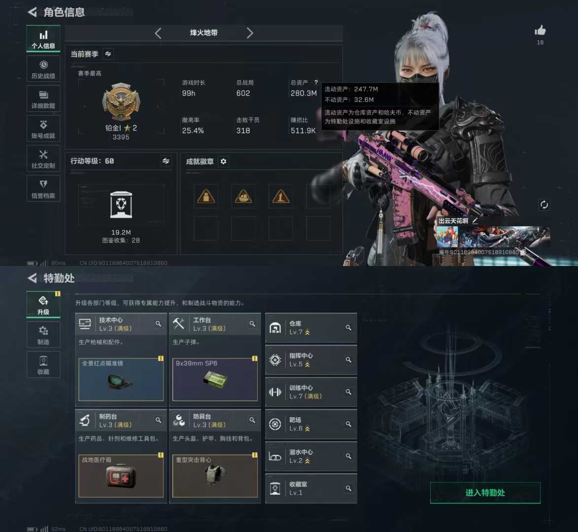 q区可2 腾龙气象感应雷粉色优品c qbz王牌之剑优品b 58发awm子弹 5个高级咖啡豆 3x3已做 总资产280m现金171m 满级体力 6级靶场 7级仓库 5级指挥中心