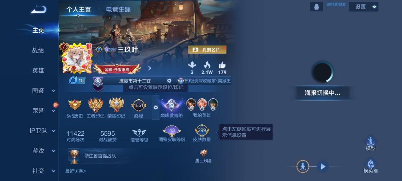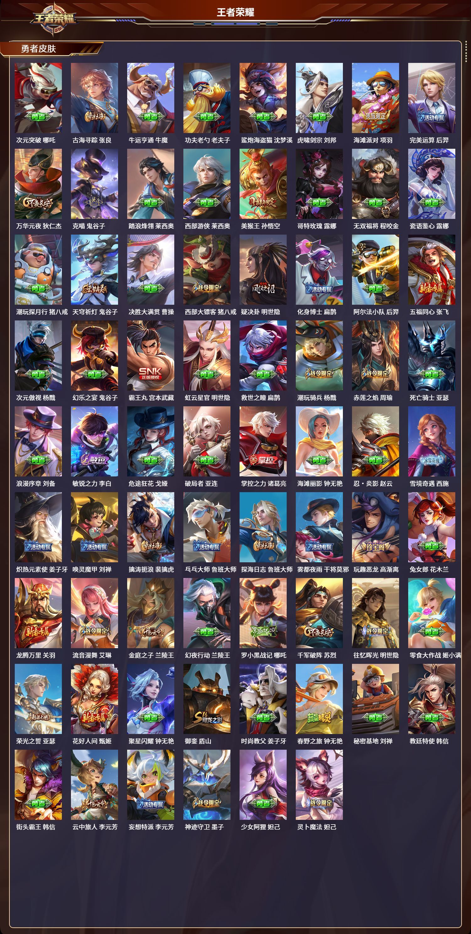 安卓QQ/荣耀王者/299皮肤/125英雄/1典藏/0珍品无双/0无双/1珍品传说/14传说/92史