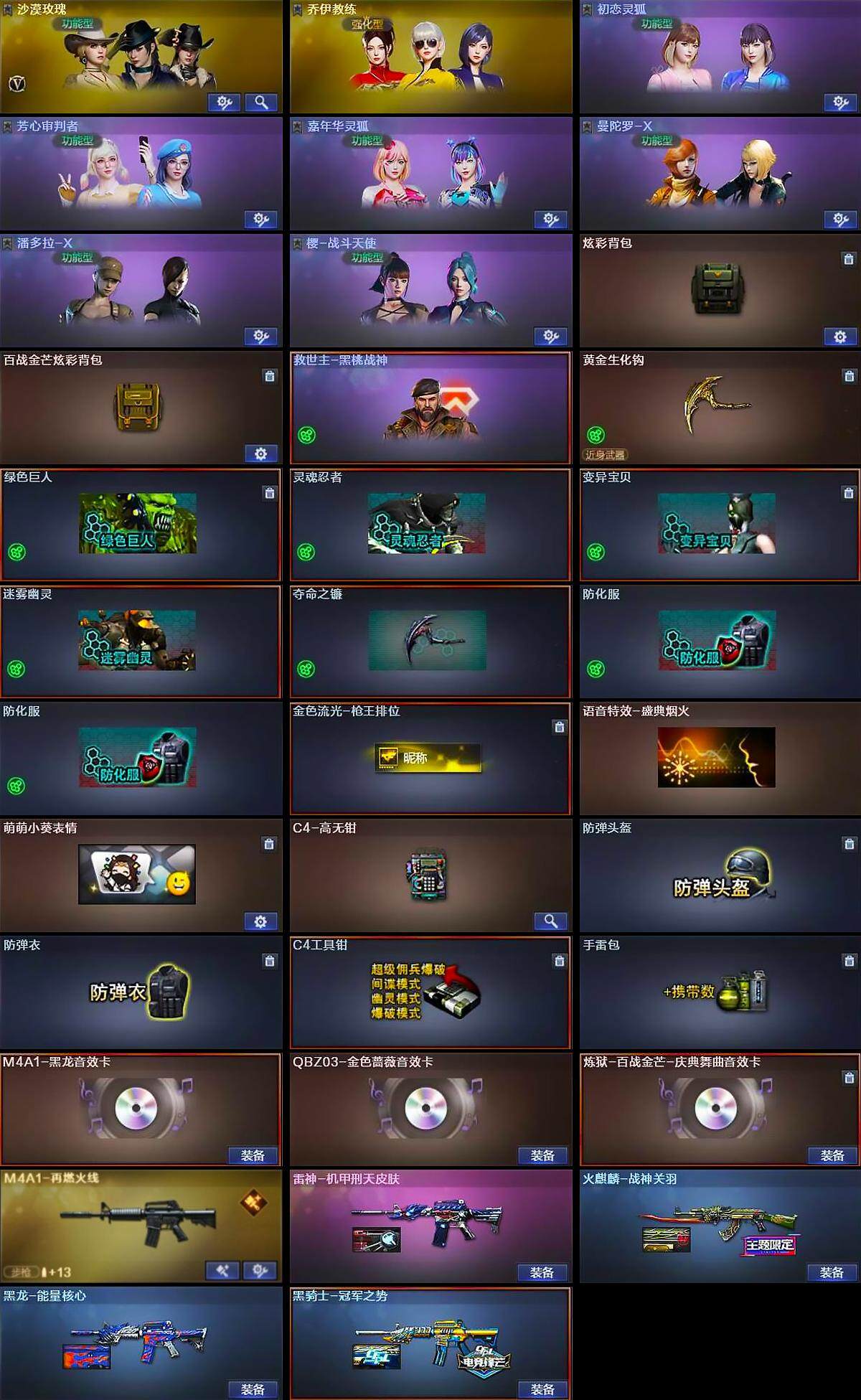【皮肤】:雷神-机甲刑天皮肤,M4A1-再燃火线,火麒麟-战神关羽,黑龙-能量核心,黑骑士-冠军之势,轻型军用手斧-再燃火线