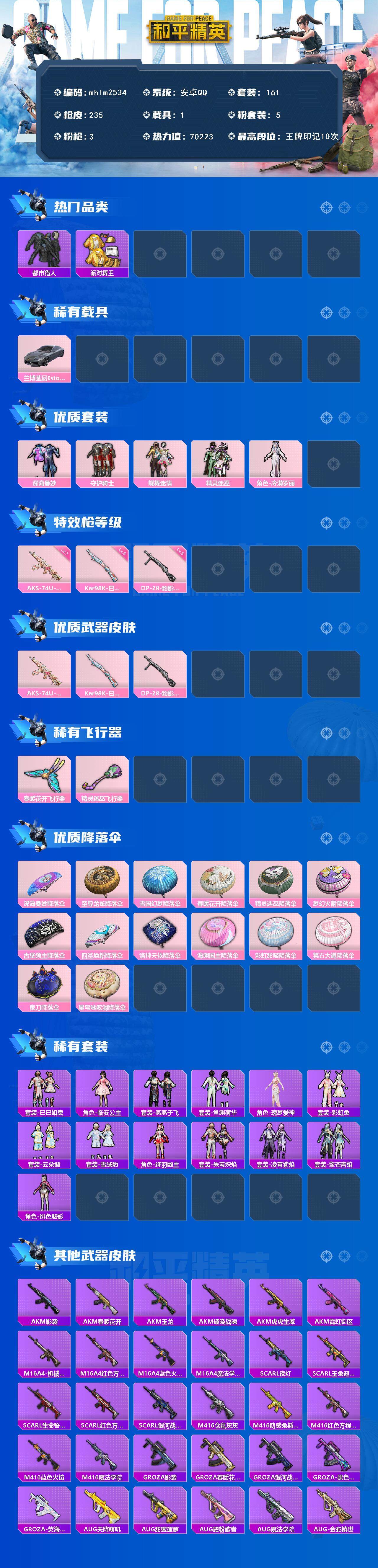 【mhlm2534】安卓 手Q-5粉装-3特效枪-1载具-3粉色飞行器-70223热力值-10王牌印记-161套装-235枪皮