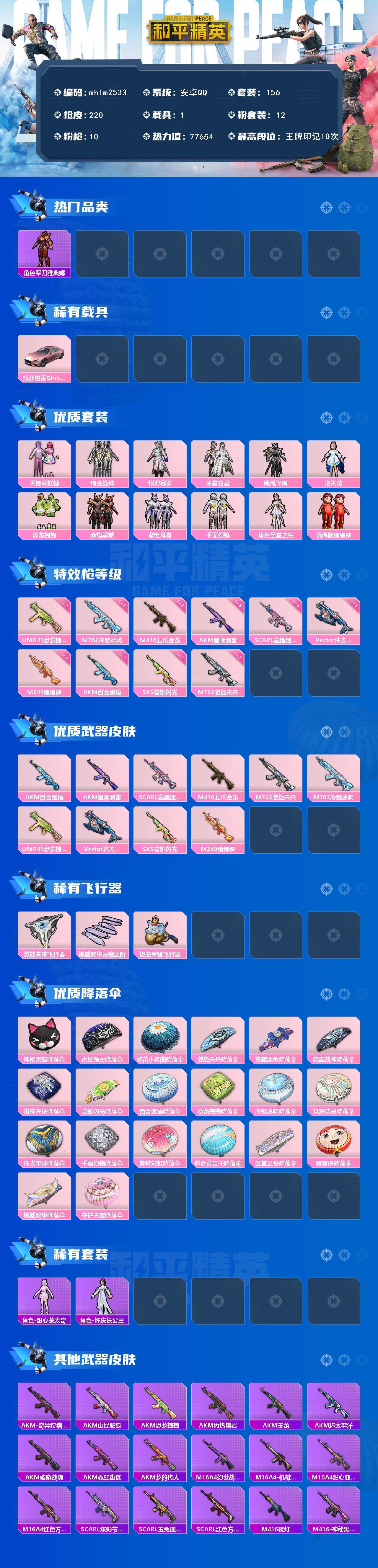 【mhlm2533】安卓 手Q-12粉装-10特效枪-1载具-3粉色飞行器-77654热力值-10王牌印记-156套装-220枪皮