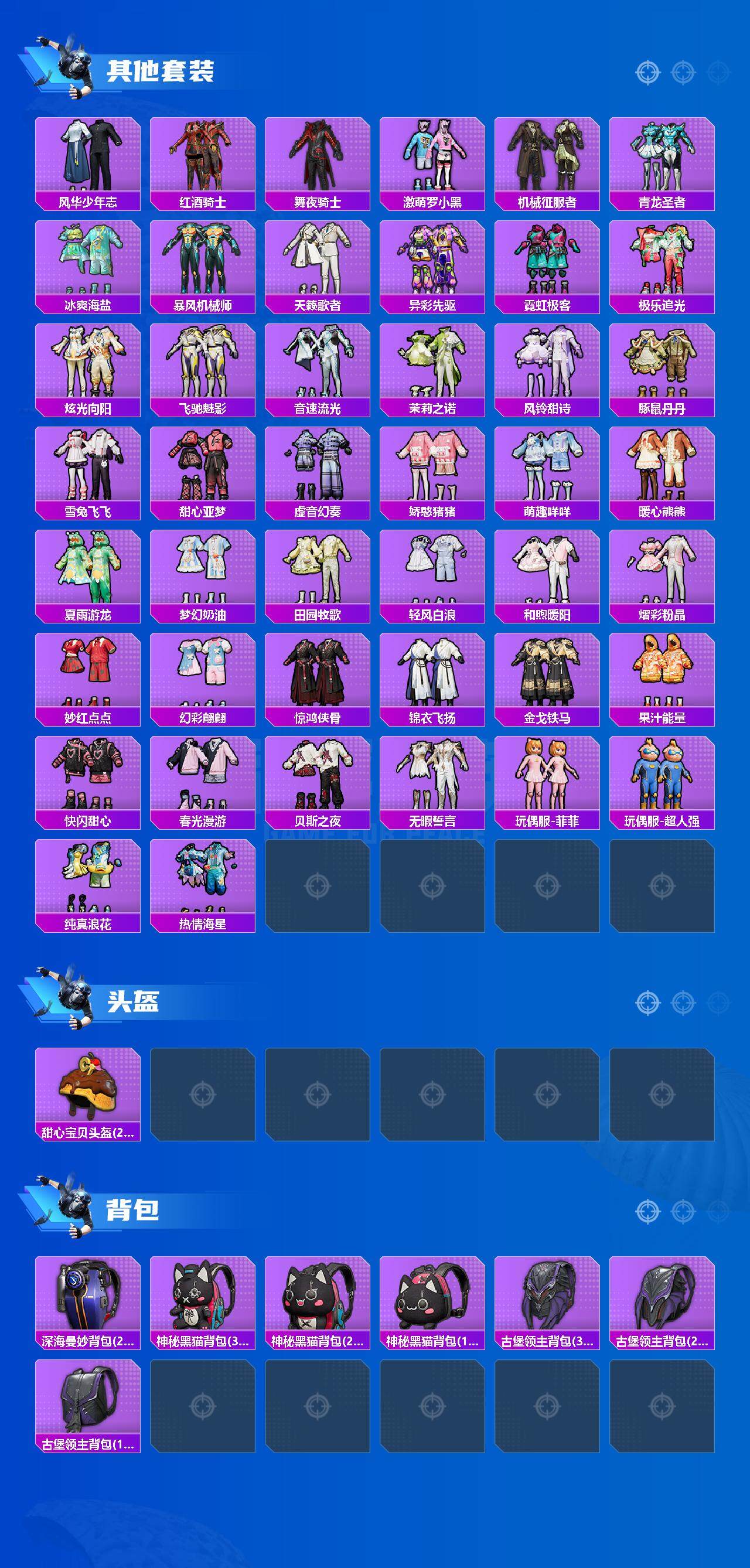 【粉色套装】:粉装-天使彩虹糖,粉装-绚金战神,粉装-银刃赛罗,粉装-冰霜白皇,粉装-飓风飞鹰,角色-洛天依,粉装-恐龙拽拽,粉装-赤焰黑爵,粉