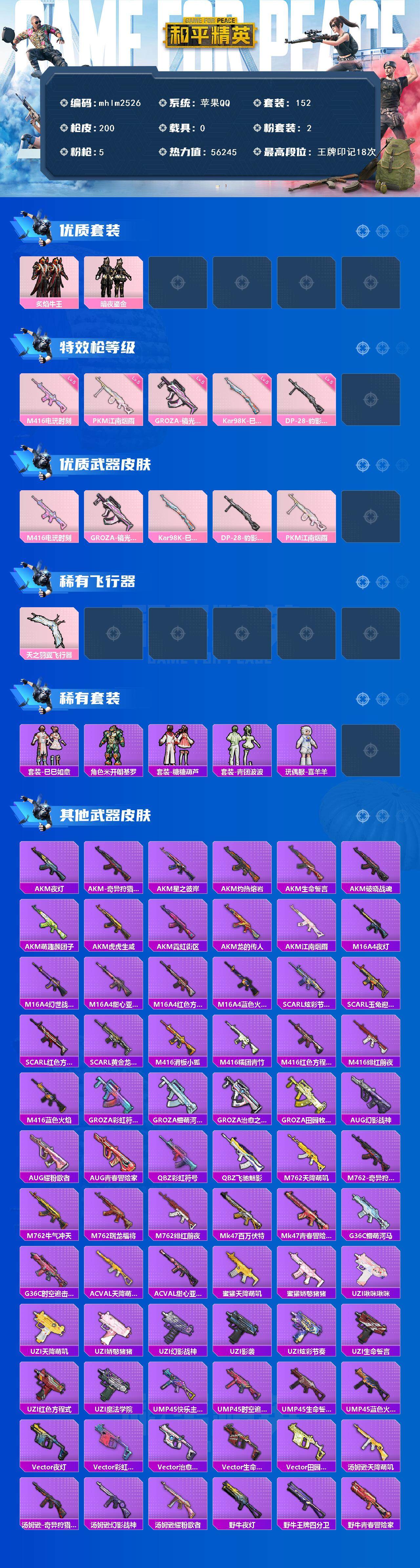 【mhlm2526】苹果 手Q-2粉装-5特效枪-0载具-2粉色飞行器-56245热力值-18王牌印记-152套装-200枪皮