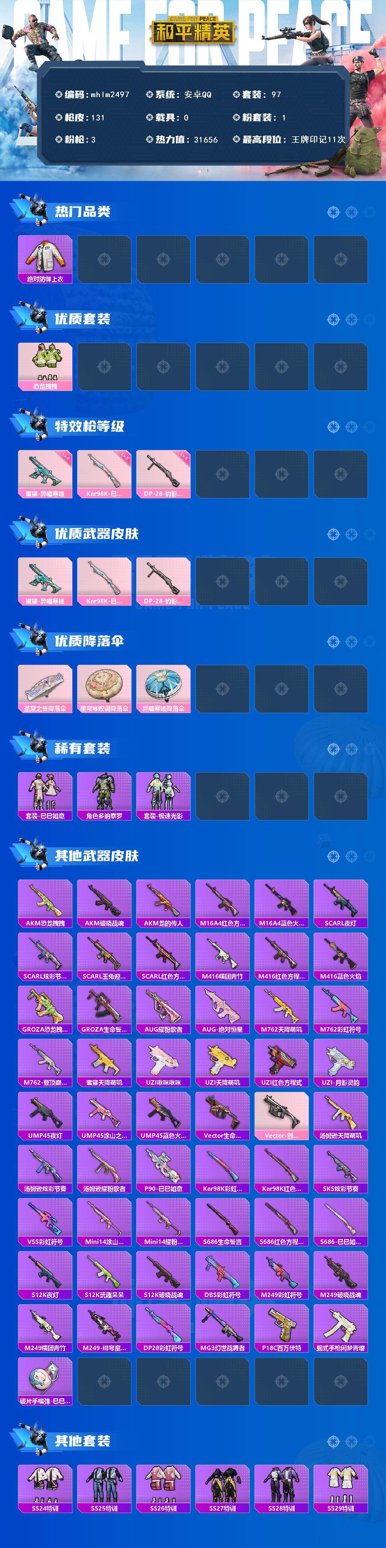【mhlm2497】安卓 手Q-1粉装-3特效枪-0载具-1粉色飞行器-31656热力值-11王牌印记-97套装-131枪皮