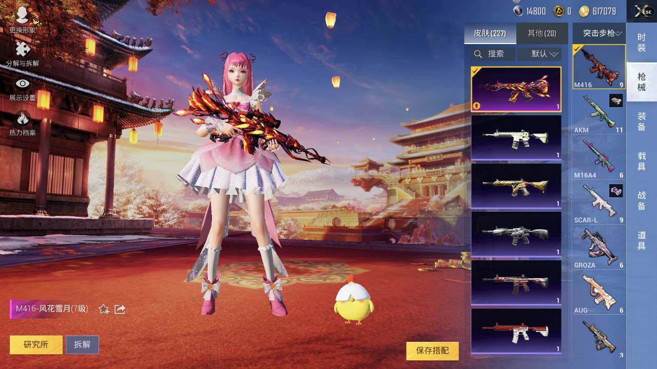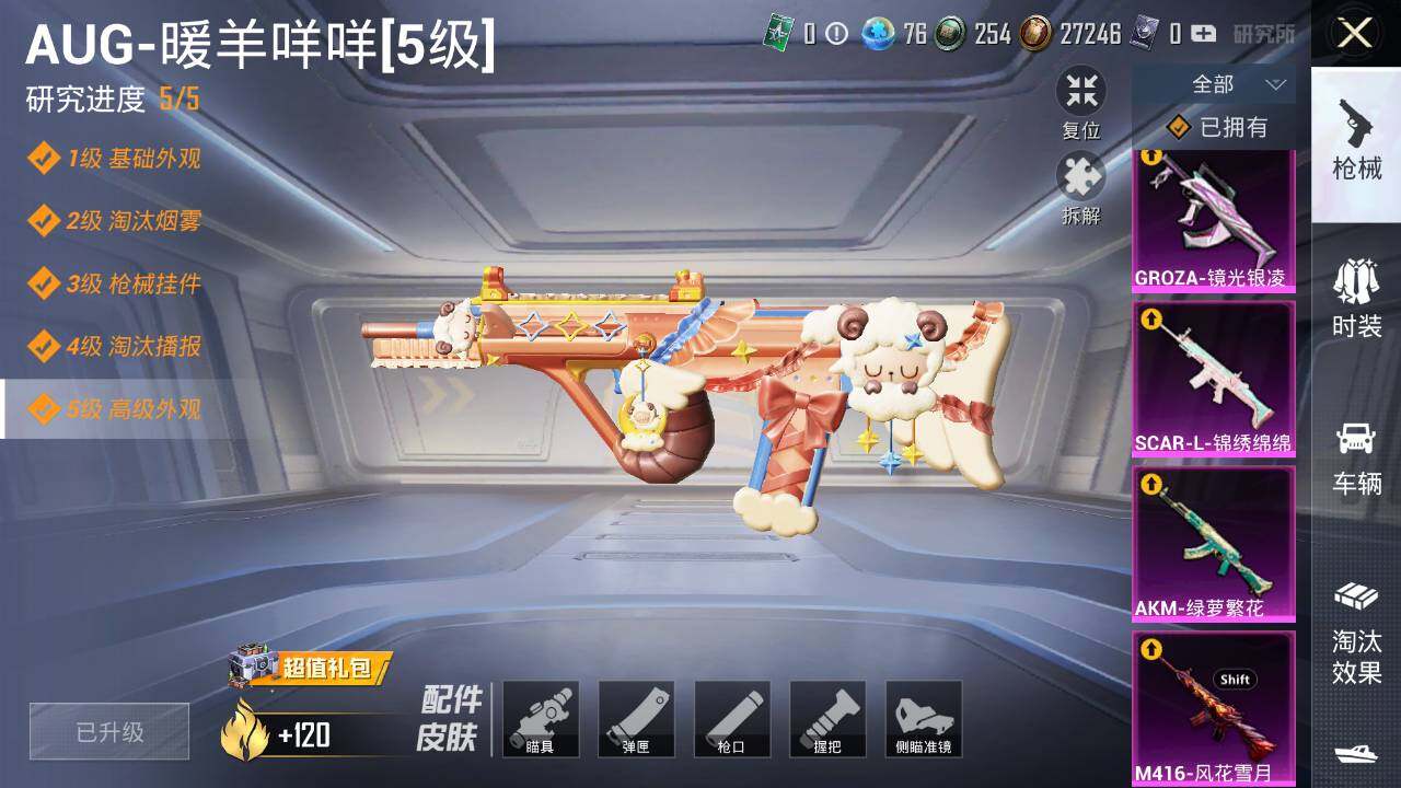 【特效枪等级】:AKM-绿萝繁花(五级AKM-绿萝繁花),SCAR-L-锦绣绵绵(五级SCAR-L-锦绣绵绵),M416-风花雪月(七级M416-风花雪月),GROZA-镜光银凌(五级GROZA-镜光银凌),AUG-暖羊咩咩(五级AUG-暖羊咩咩),Kar98K-巳巳如意(五级Kar98