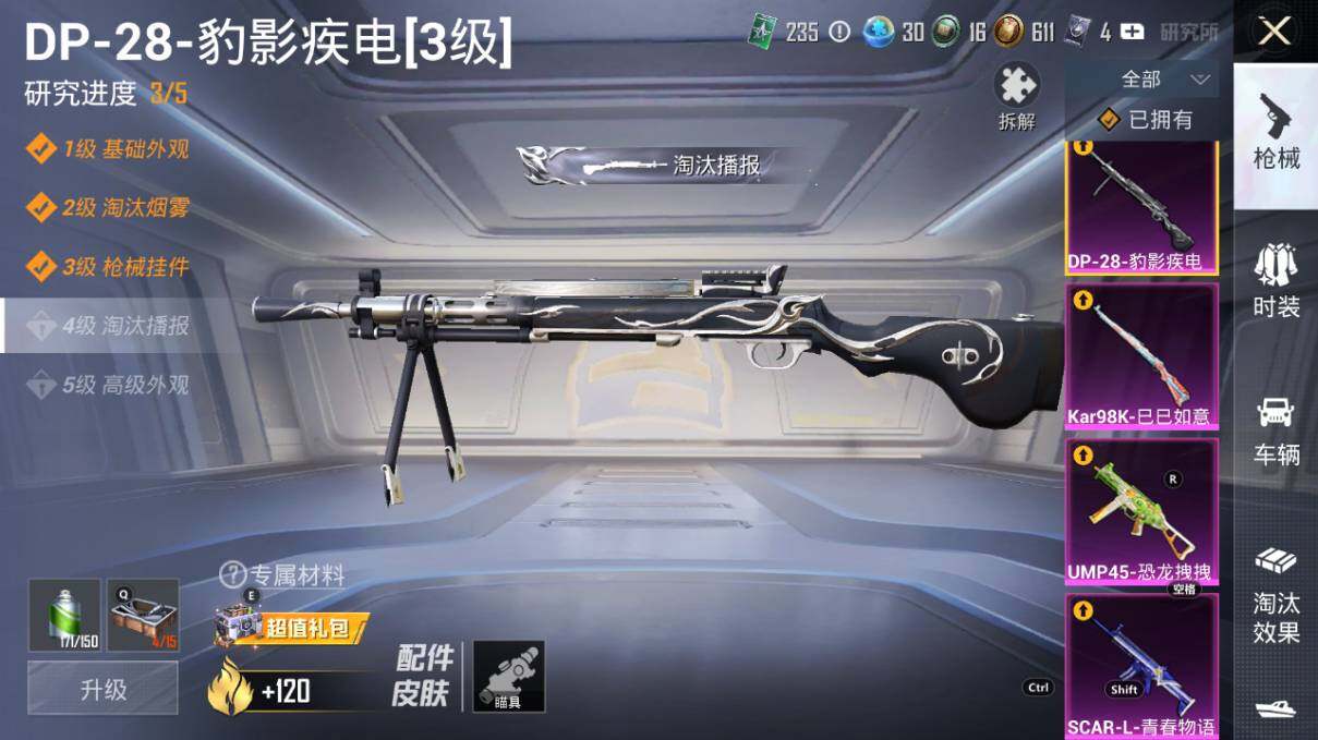 【特效枪等级】:SCAR-L-青春物语(七级),UMP45-恐龙拽拽(四级),Kar98K-巳巳如意(一级),DP-28-豹影疾电(三级)