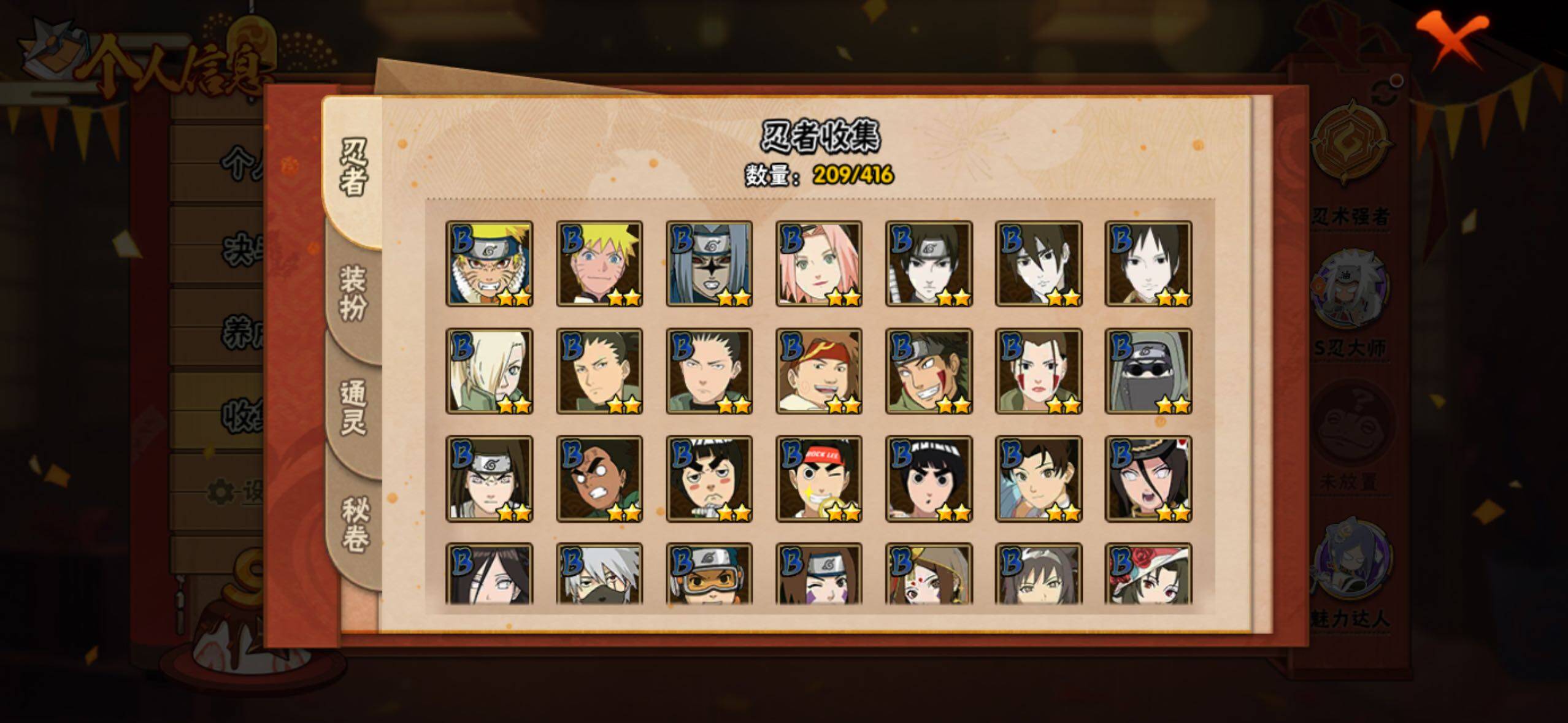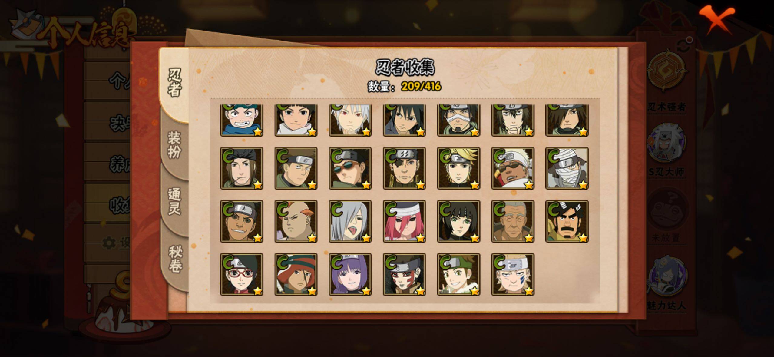 【S级忍者】:长门「秽土转生」(3星),千手柱间「秽土转生」(3星),宇智波鼬「秽土转生」(3星),宇智波斑「秽土转生·解」(3星),春野樱「忍界大战」(3星),宇智波带土「忍界大战」(3星),艾「忍界大战」(3星),宇智波鼬「须佐能乎」(3星),宇智波止水「须佐能乎」(3星