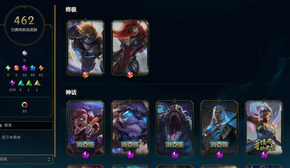 172英雄/462皮肤/2终极/19神话/46限定/3臻彩/85炫彩