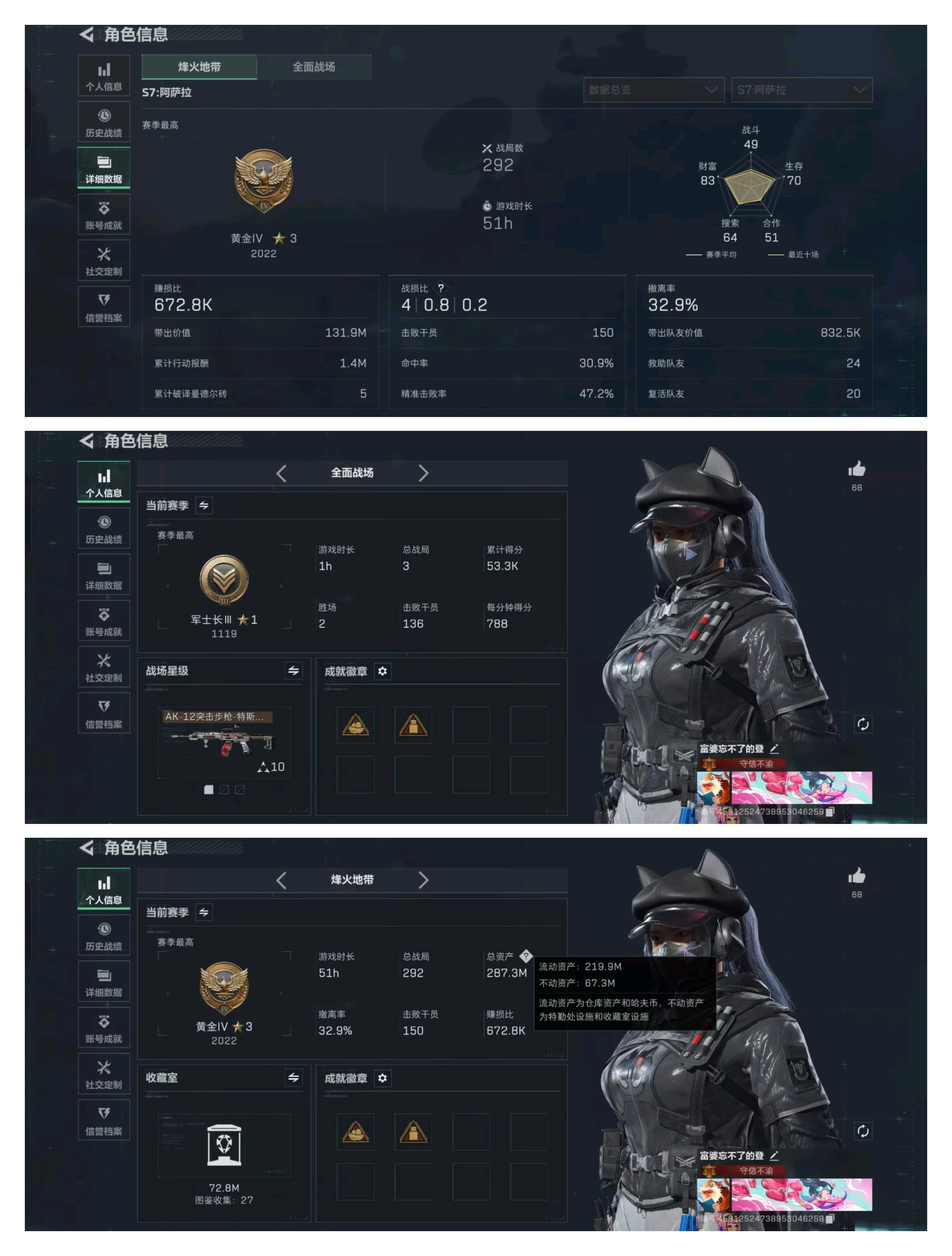 总资产:287.3M 1干员外观 18传说枪械 顶级安全箱(3×3)11.28号到期 哈夫币:75.