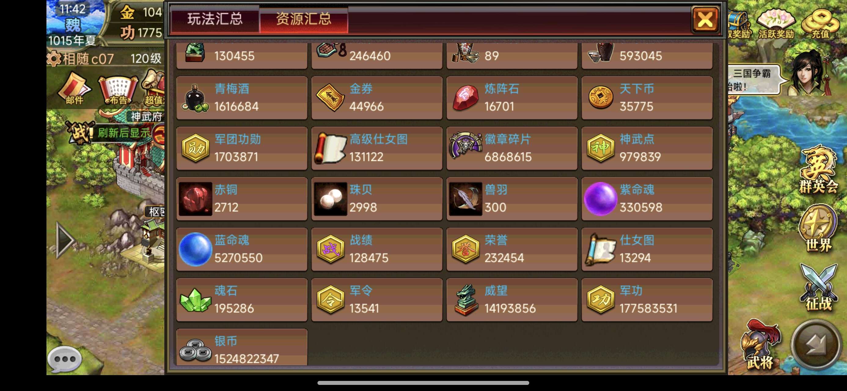还价勿扰,金104.9万,酒多资源好,充了老玩家,自带天公张角外加神将宝箱,夷陵势力