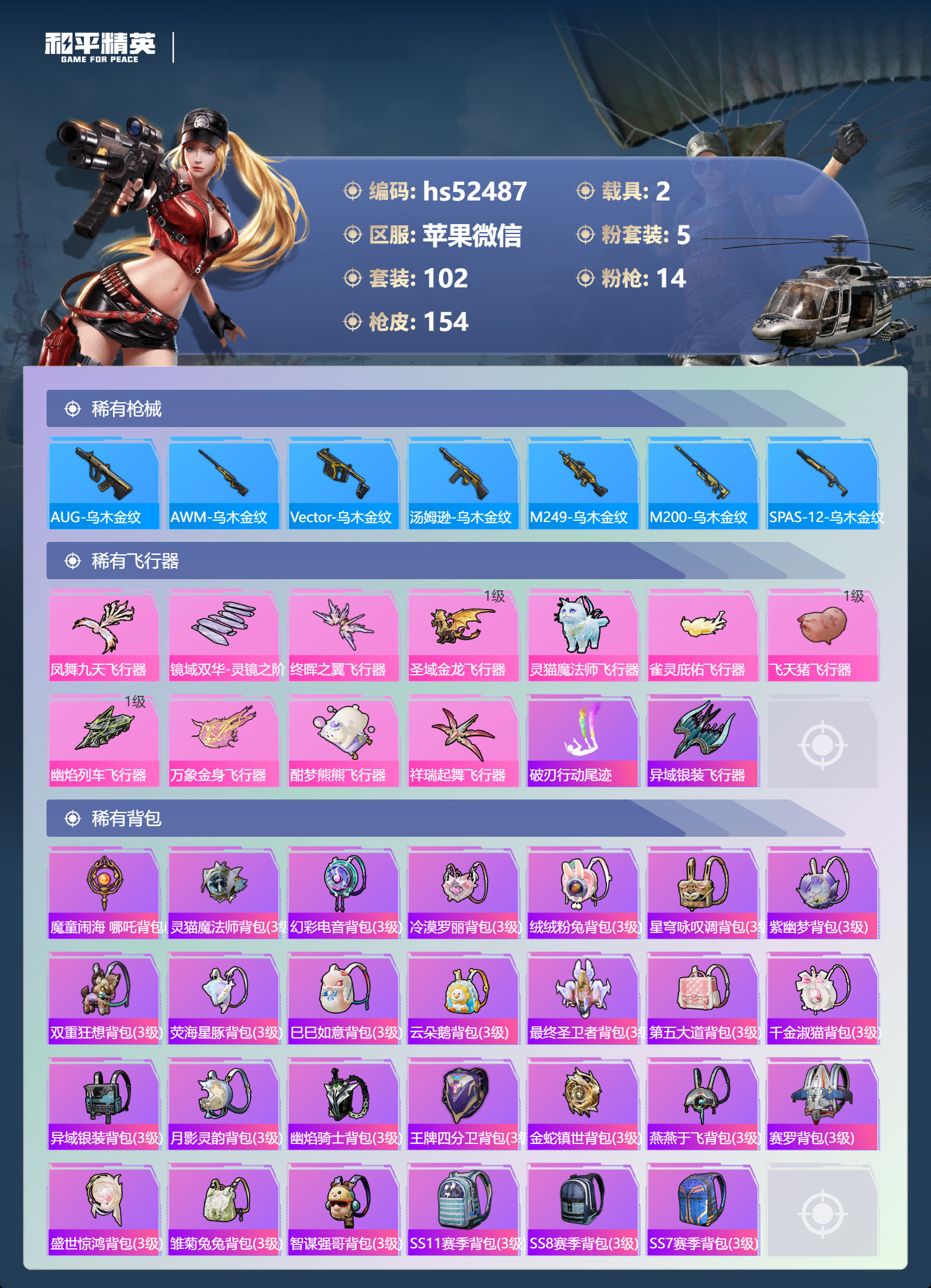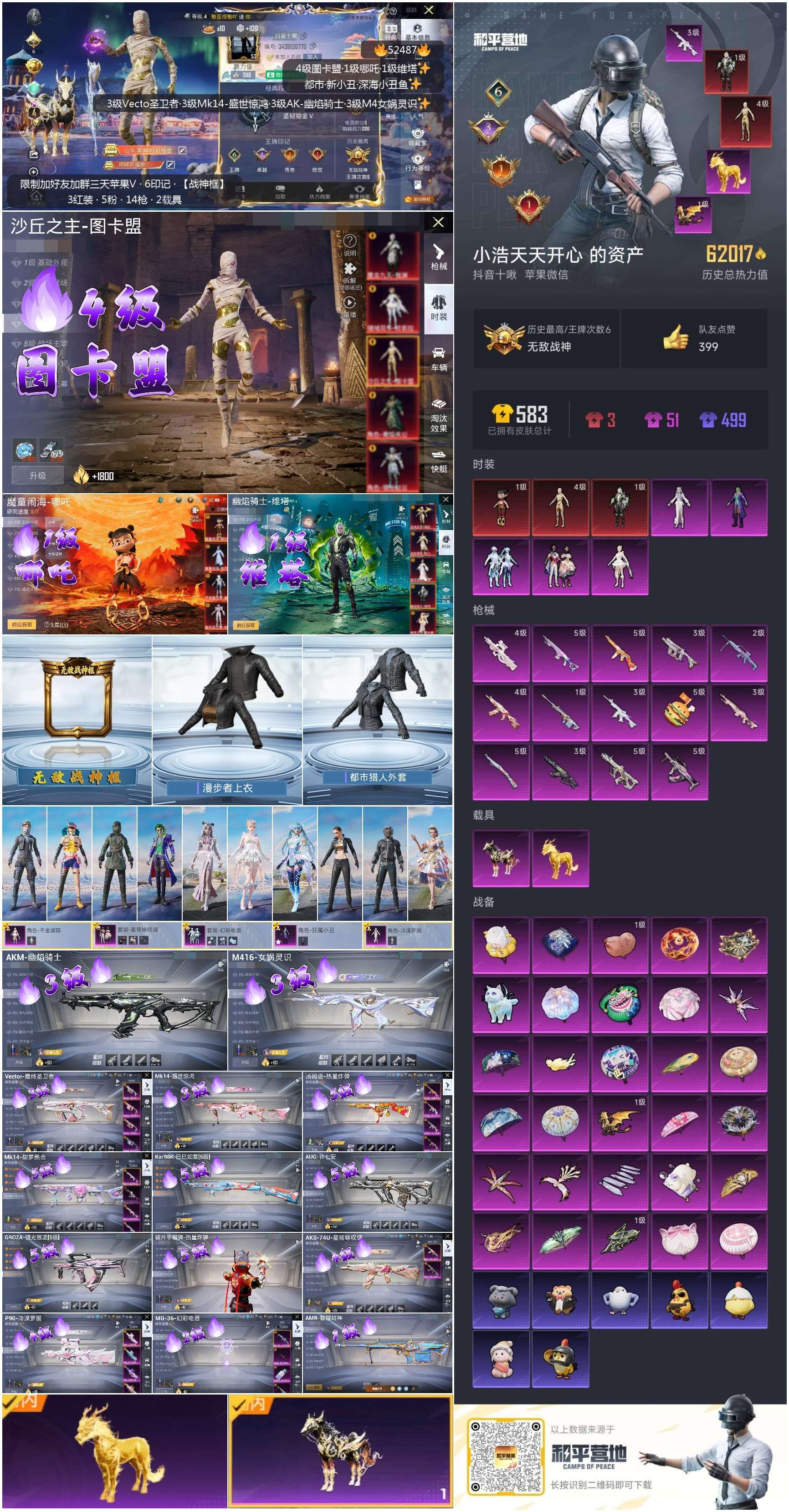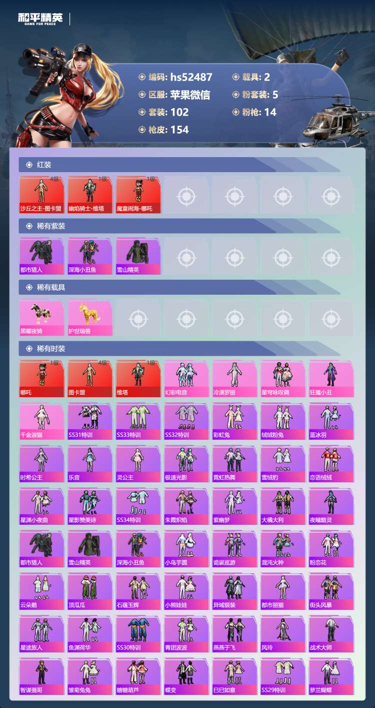 hs52487 苹果微-6王牌印记-有战神框-3红装-5粉装-14特效枪-2载具